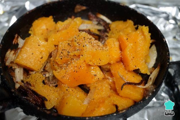 Cuando tengas la cebolla bien pochada, añade la calabaza ya cocida, un poquito de sal y pimienta. Asimismo, con cuidado rehoga un par de minutos todo junto para que se mezclen los sabores.
