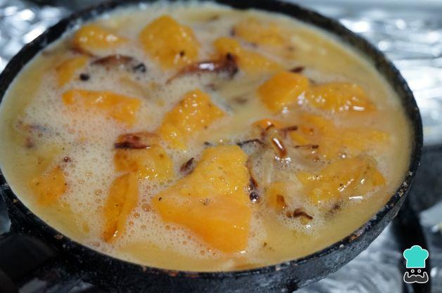 En la misma sartén de pochar la cebolla añade un poco más de aceite e incorpora toda la mezcla de la tortilla repartiendo bien la calabaza para que quede bien. Deja que se vaya cuajando a fuego medio.
