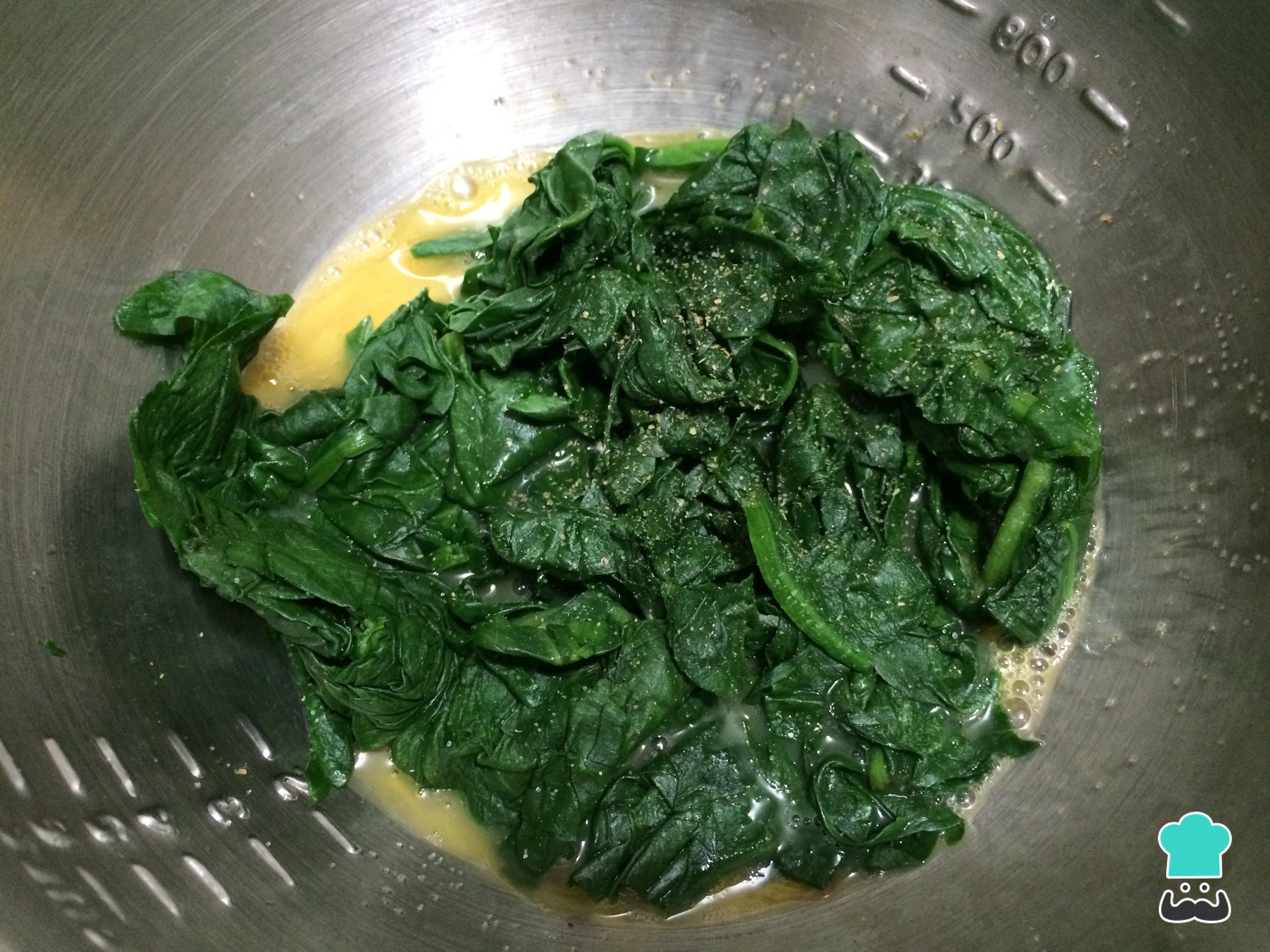 Una vez estén listas las espinacas, secarlas una a una lo que más se pueda y cortarlas un poco. Luego, mezclar con los huevos batidos y sazonar con sal y pimienta.