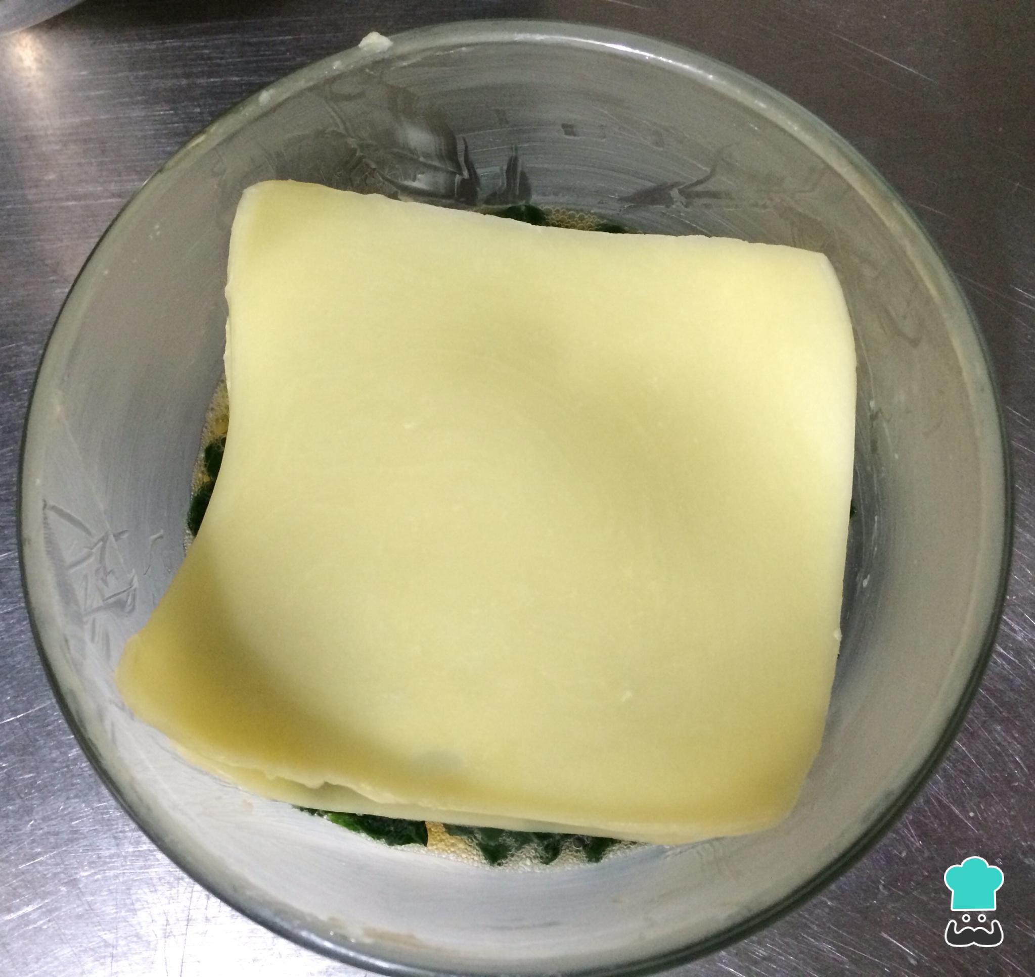 Untar con mantequilla una refractaria para evitar que se pegue la tortilla. Agregar en ésta la mitad de las espinacas y cubrir con las lonchas de queso.