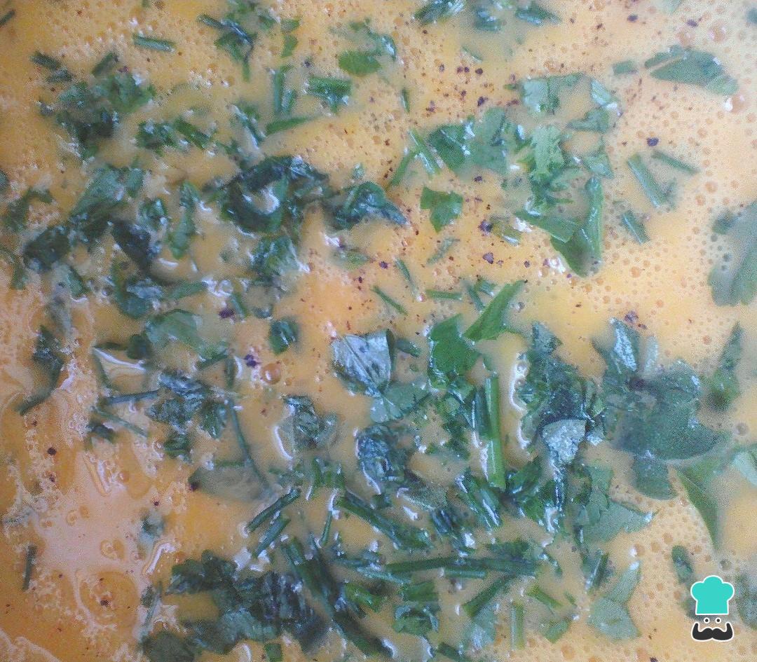 Batir el huevo y agregar sal, pimienta, ajo, perejil, orégano, etc... al gusto. Yo voy a hacer una tortilla de huevo de ñandú que es una avestruz americana.