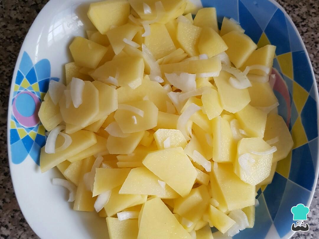 El primer paso para hacer nuestra tortilla de patatas rellena, será lavar, pelar y cortar en trozos finitos las patatas y la cebolla. Echa todo esto en un cuenco apto para microondas y añade un chorrito de aceite.