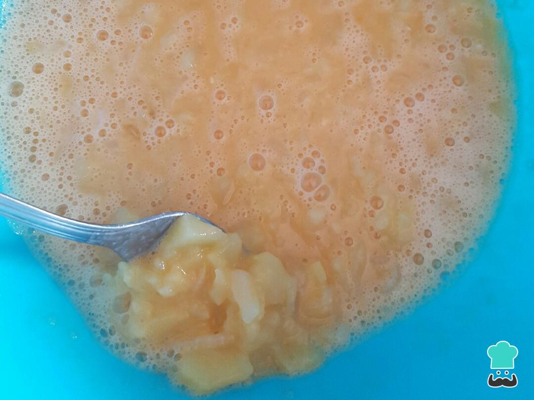 Cuando el cuenco del microondas esté listo y las patatas están blanditas, sacamos y añadimos al bol con los huevo. Remueves todo hasta que se mezclen bien ambas preparaciones.