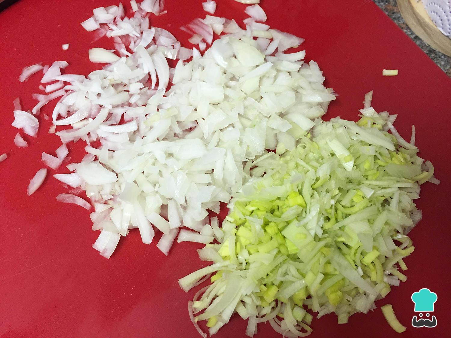 Lo primero que hacemos para empezar a preparar la tortilla de patatas es picar bien pequeño la cebolla y el puerro. Esto va a gustos, por lo que puedes trocear estos ingredientes un poco más grande si lo prefieres. Yo acostumbro a hacerlo de esta forma para que la posterior cocción sea más rápida.