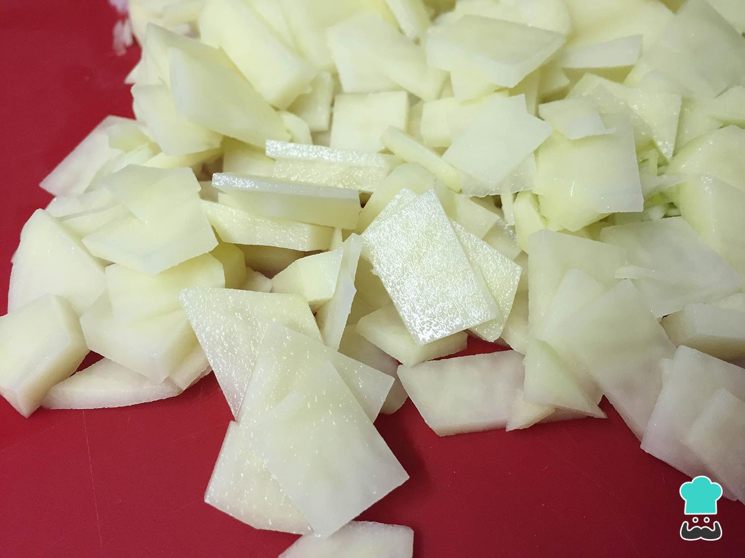 Cuando tenemos la cebolla y el puerro picados, pasamos a pelar las patatas, lavarlas y trocearlas también al gusto. Como recomendación, te diría que las cortaras en cubos pequeños o dados finos, tal y como hice yo. Este truco es muy efectivo para conseguir que se cocinen más rápido. No obstante, como comento en el paso anterior, si prefieres optar por trozos más grandes es totalmente válido, ¡la tortilla española quedará deliciosa igual!