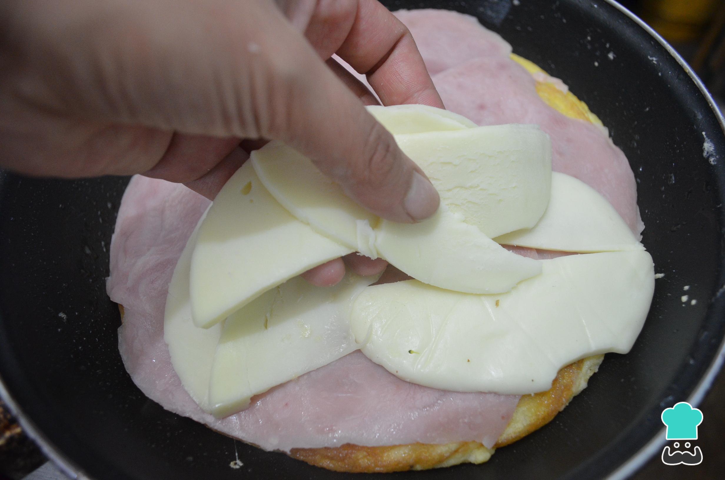 Cubre la tortilla de patatas con rebanadas de jamón y queso.