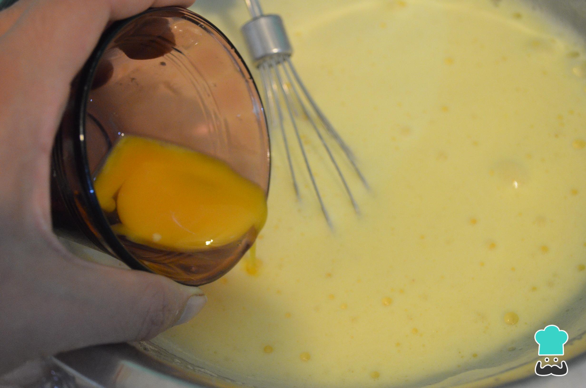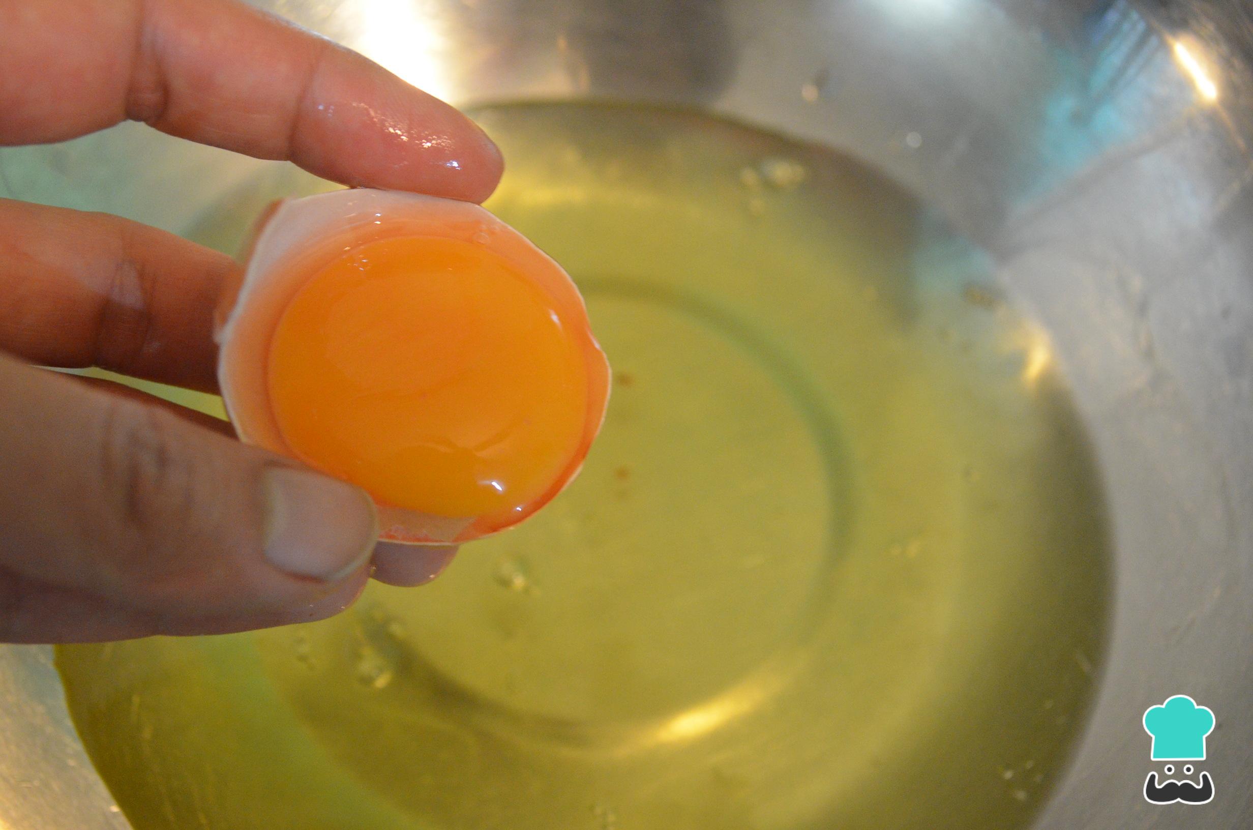 Bate las claras vigorosamente, y cuando estén a punto de nieve incorpora suavemente las yemas de una en una.