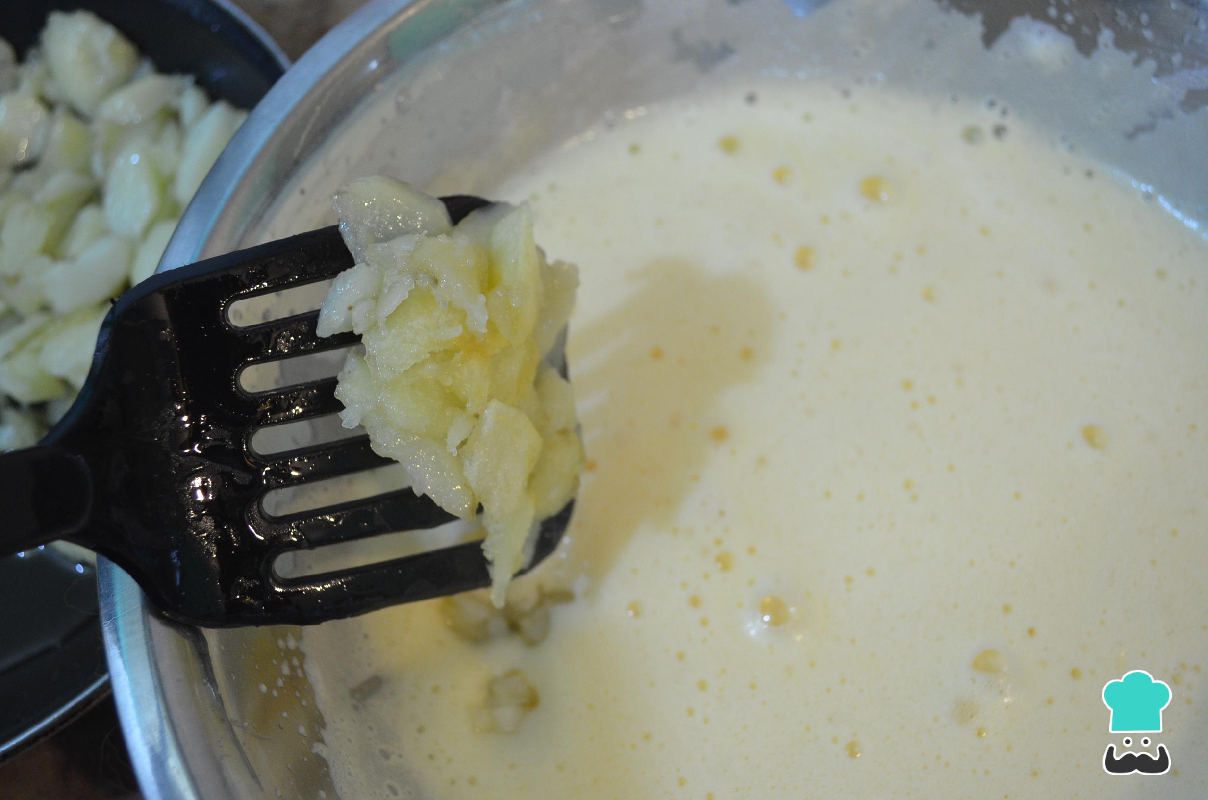 Retira las papas del fuego y escurre el exceso de aceite. Agrega las papas a la mezcla de huevo e incorpora suavemente. Reserva el aceite que te haya sobrado en la sartén.