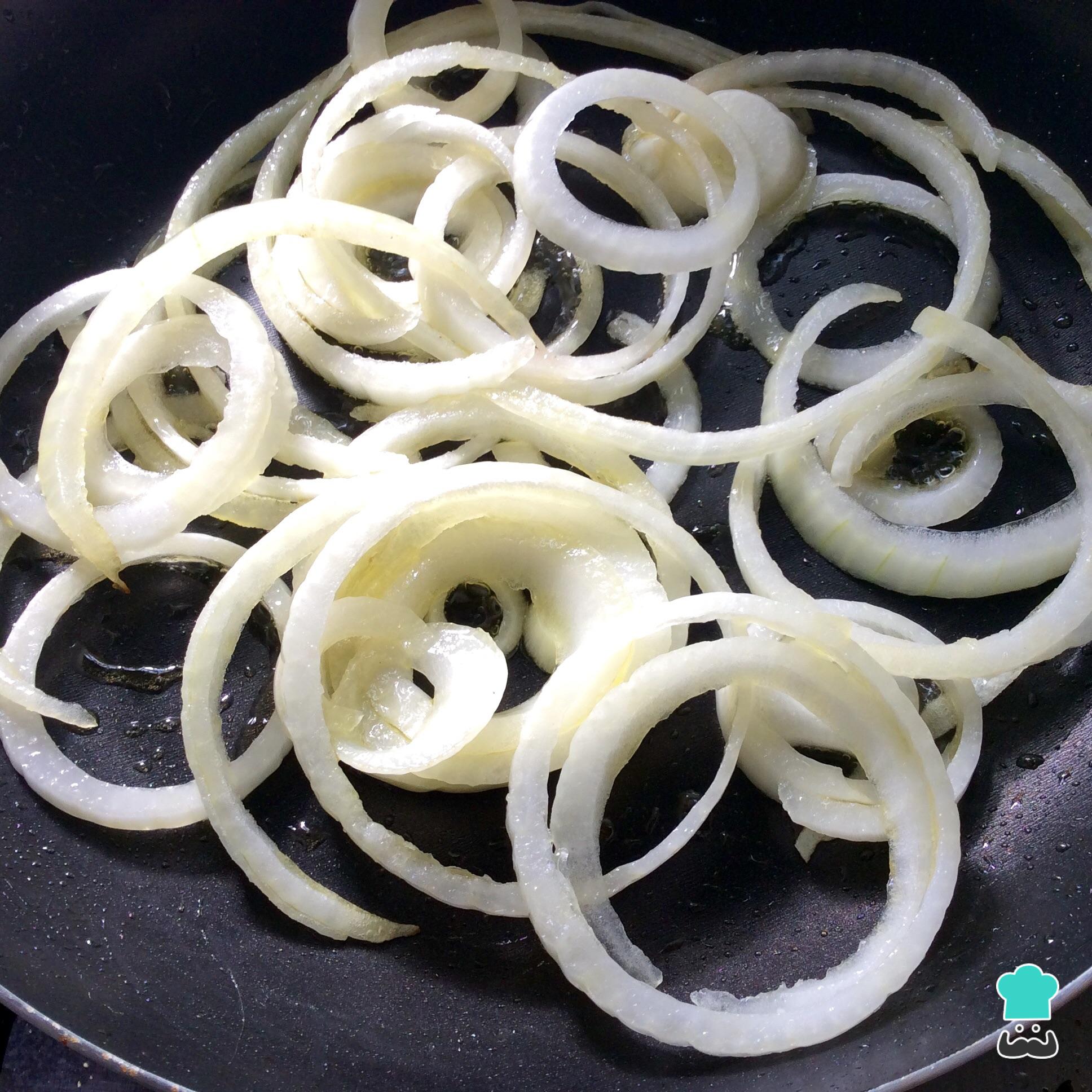 Corta la cebolla en aros y cocínalos en un sartén anti adherente con un poco de aceite de oliva durante 4 minutos.