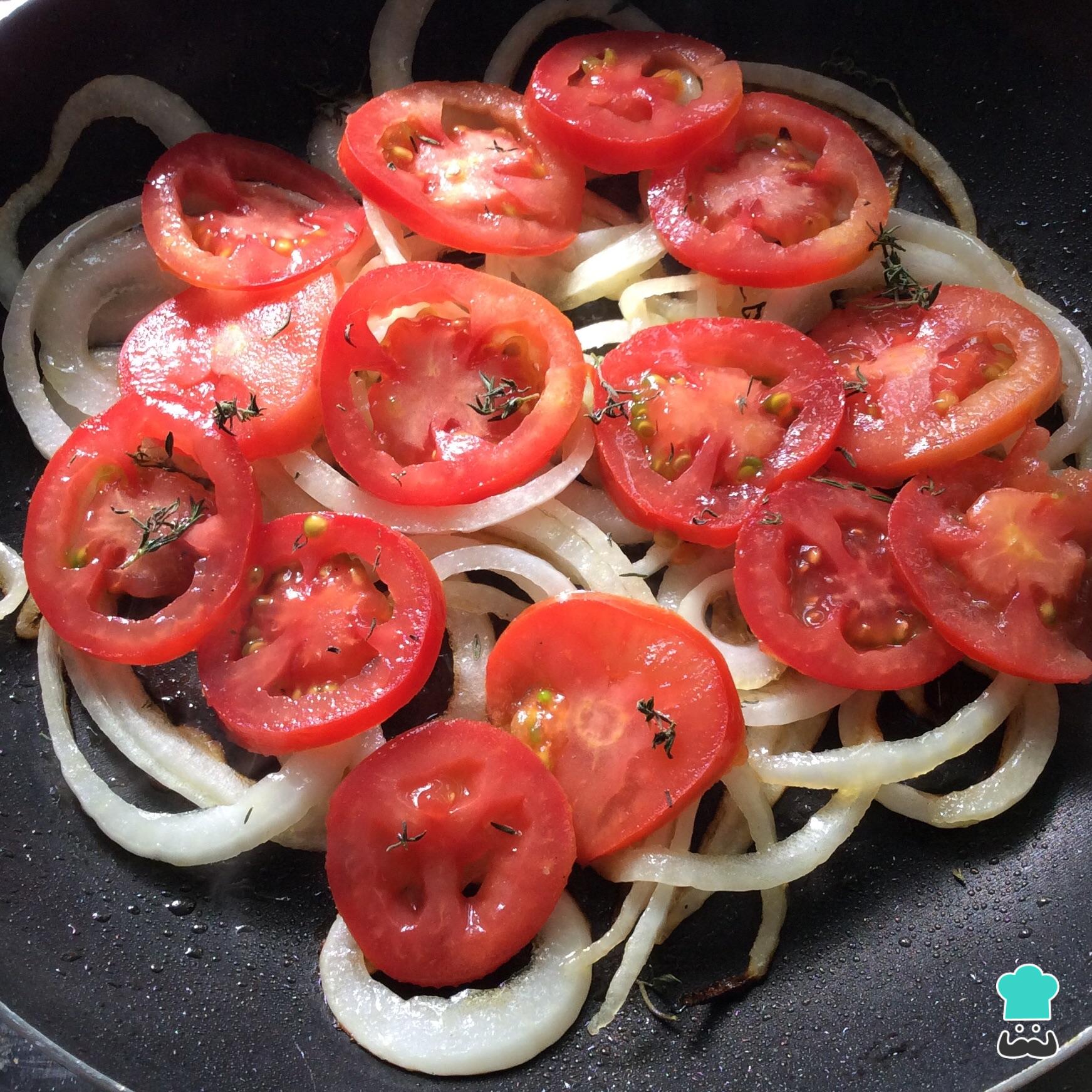 Pasados los 4 minutos agrega el tomate cortado en rodajas no muy delgadas cocina durante 3 minutos, agrega tomillo sal y pimienta.