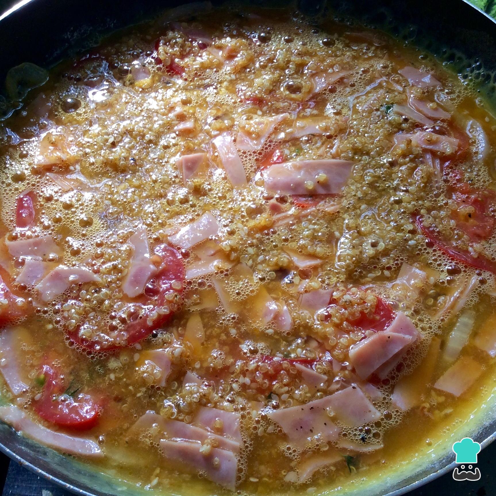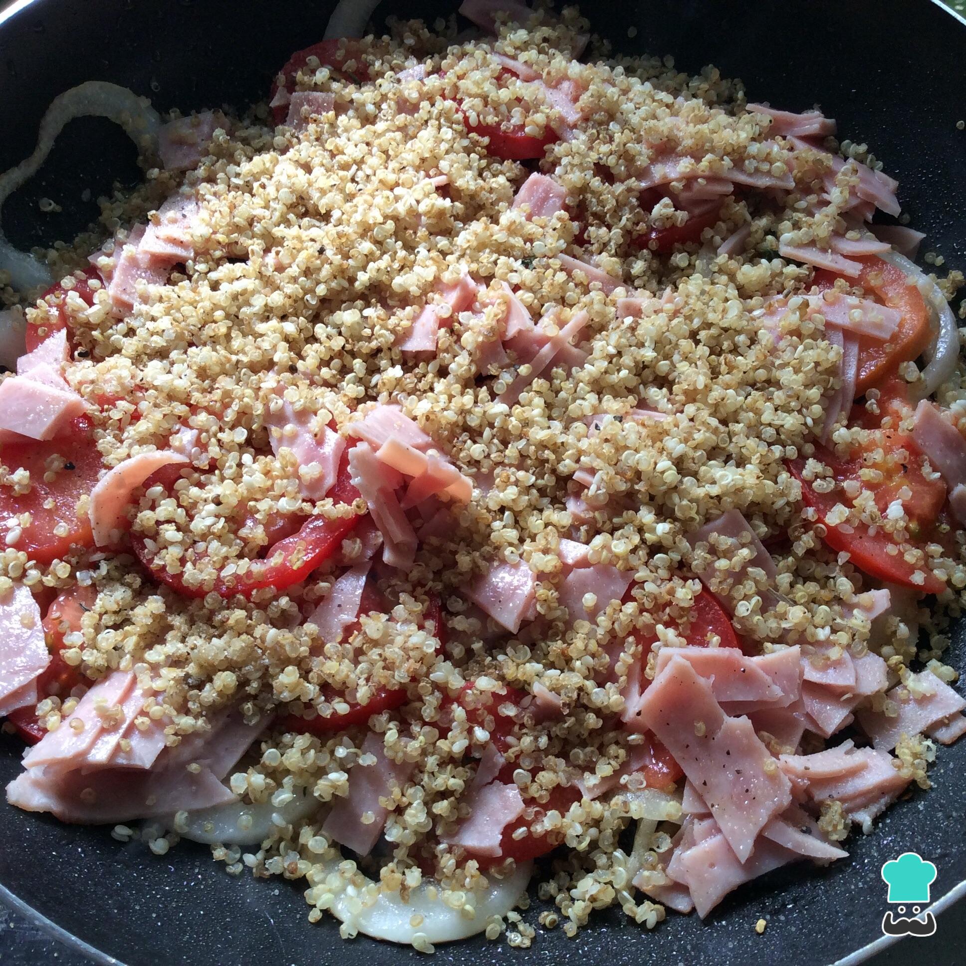 Por ultimo agrega la quinoa previamente cocinada en agua y el jamón de pavo cortado en cuadros, estos dos últimos son al gusto por si deseas agregar mas o menos.
