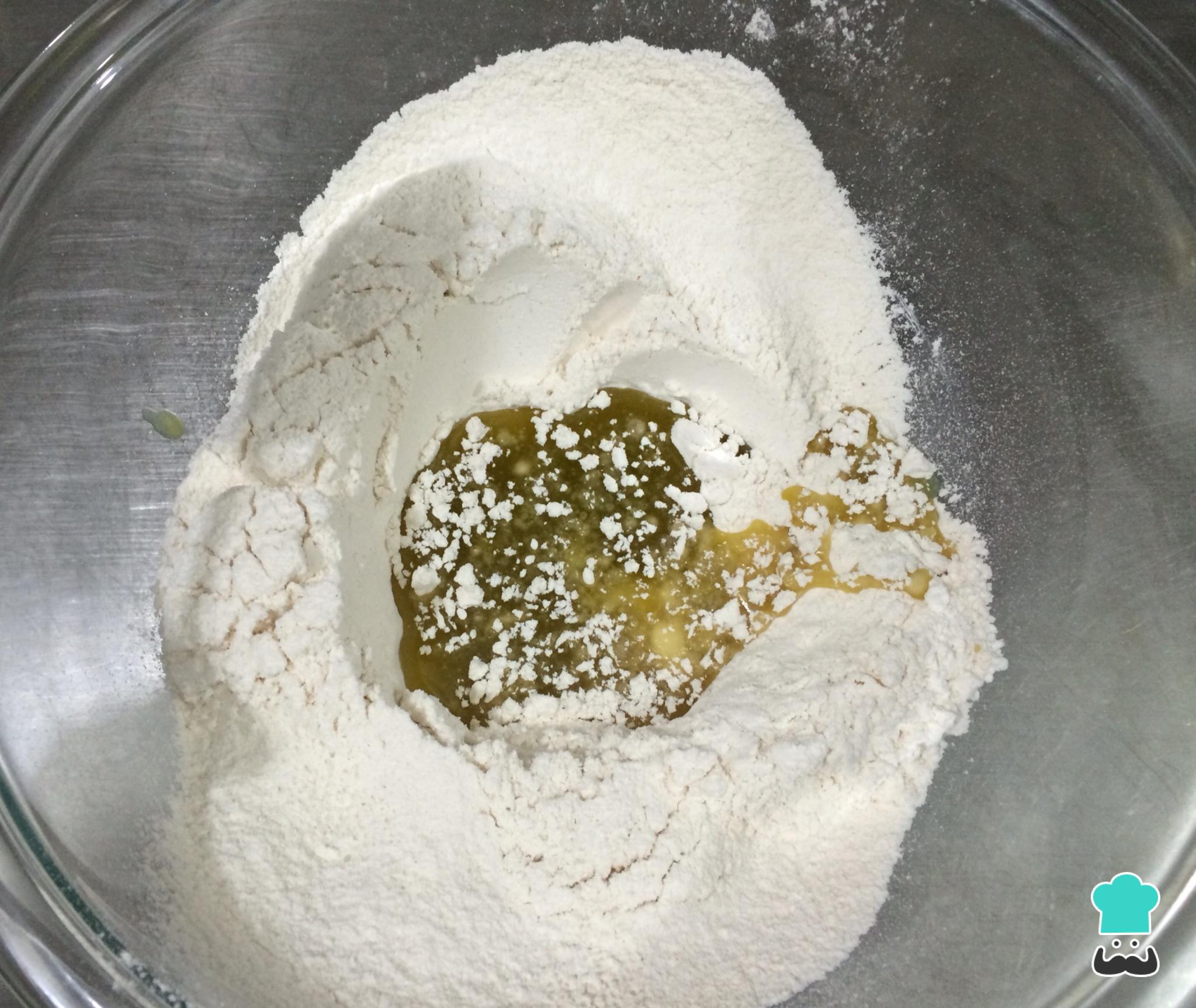 En un bol cernir la harina y mezclar con la sal, hacer un volcán y en el centro agregar el aceite de oliva, empezar a integrar de a poco con la harina.