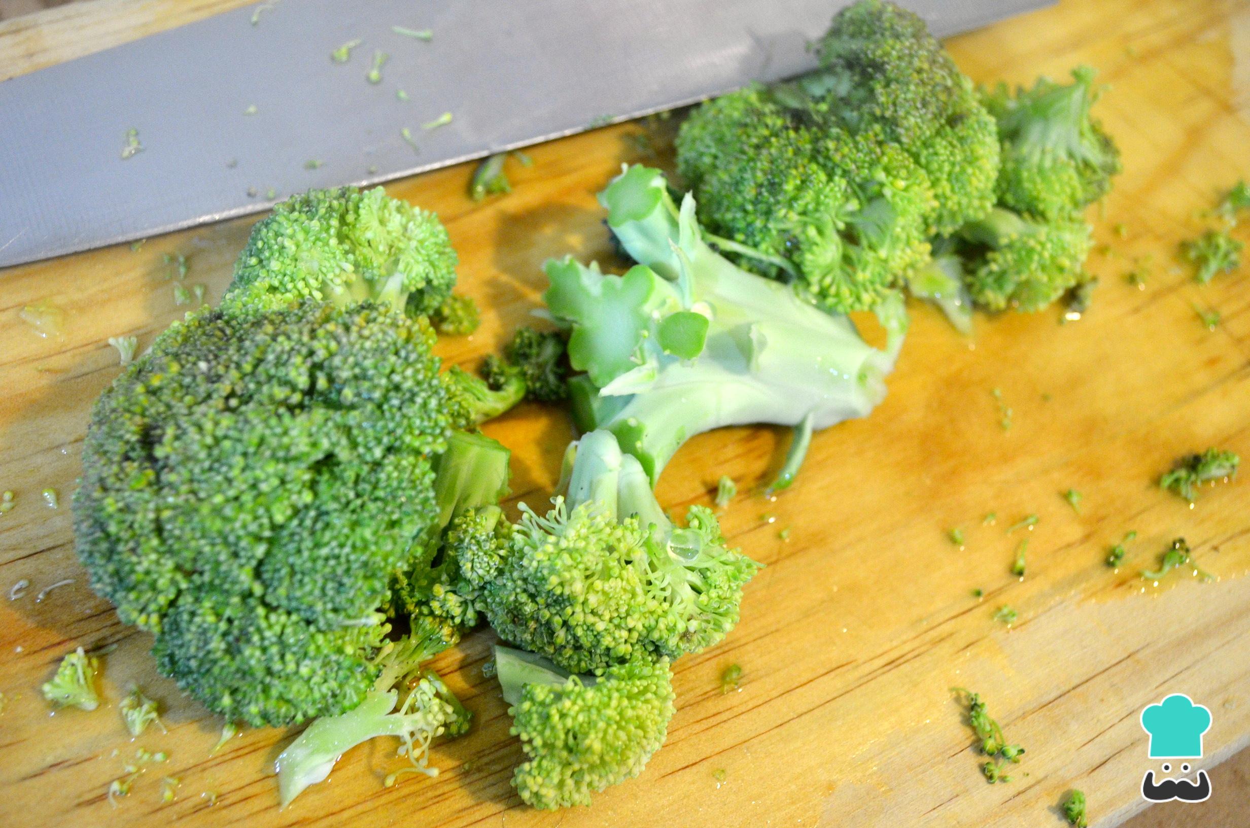 Para preparar nuestras tortitas de brócoli al horno desinfectamos, escurrimos y troceamos el brócoli. También precalentamos el horno a 200ºC.
