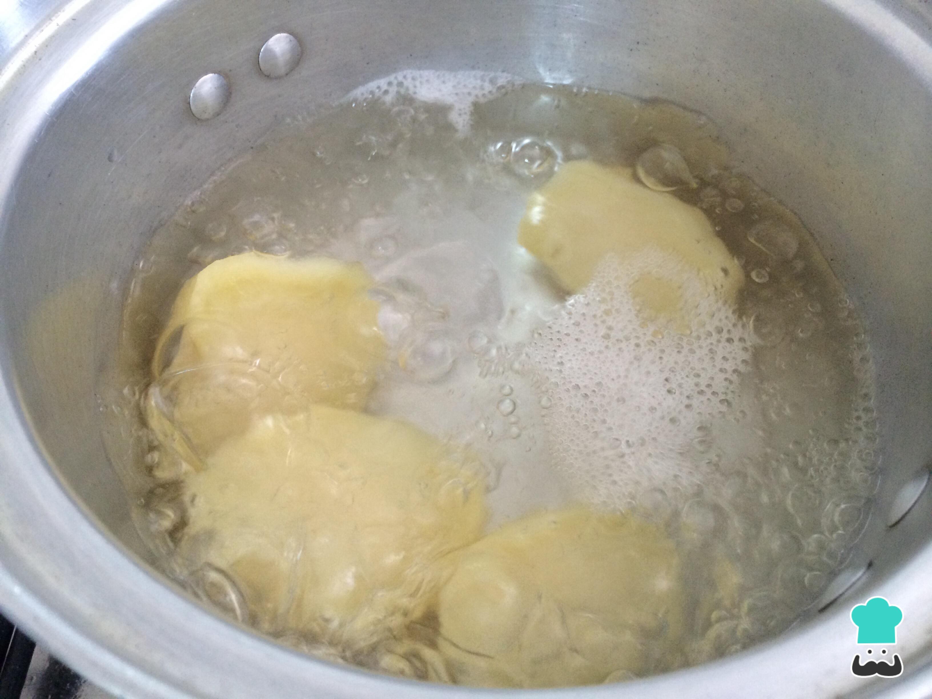 En una olla con agua hirviendo y una pizca de sal, cocinar las patatas peladas durante 20 minutos, realizar un puré inmediatamente con la mantequilla.
