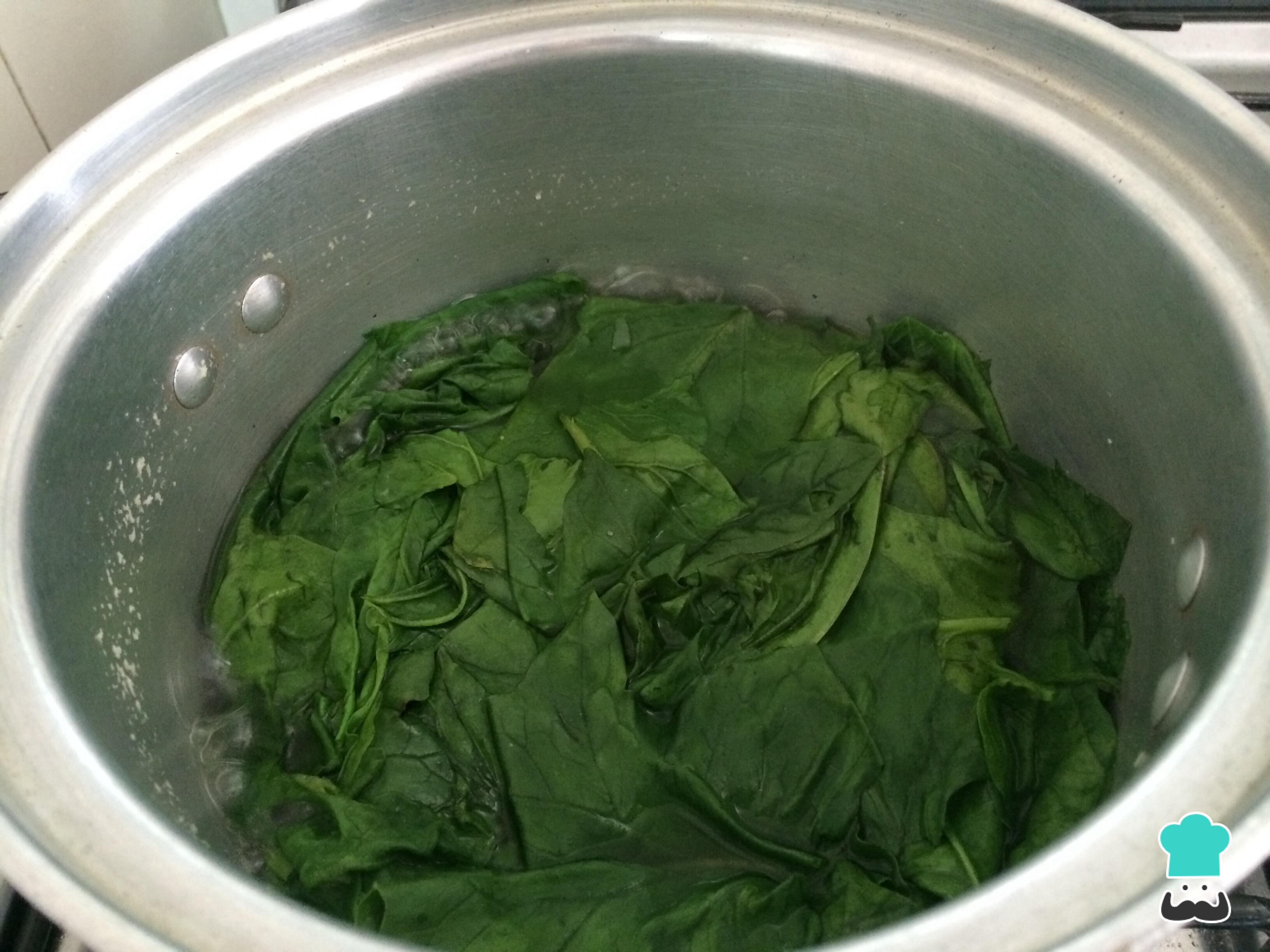 En otra olla con agua hirviendo y sal, cocinar las hojas de espinacas durante 5 minutos, escurrir y cortar finamente.