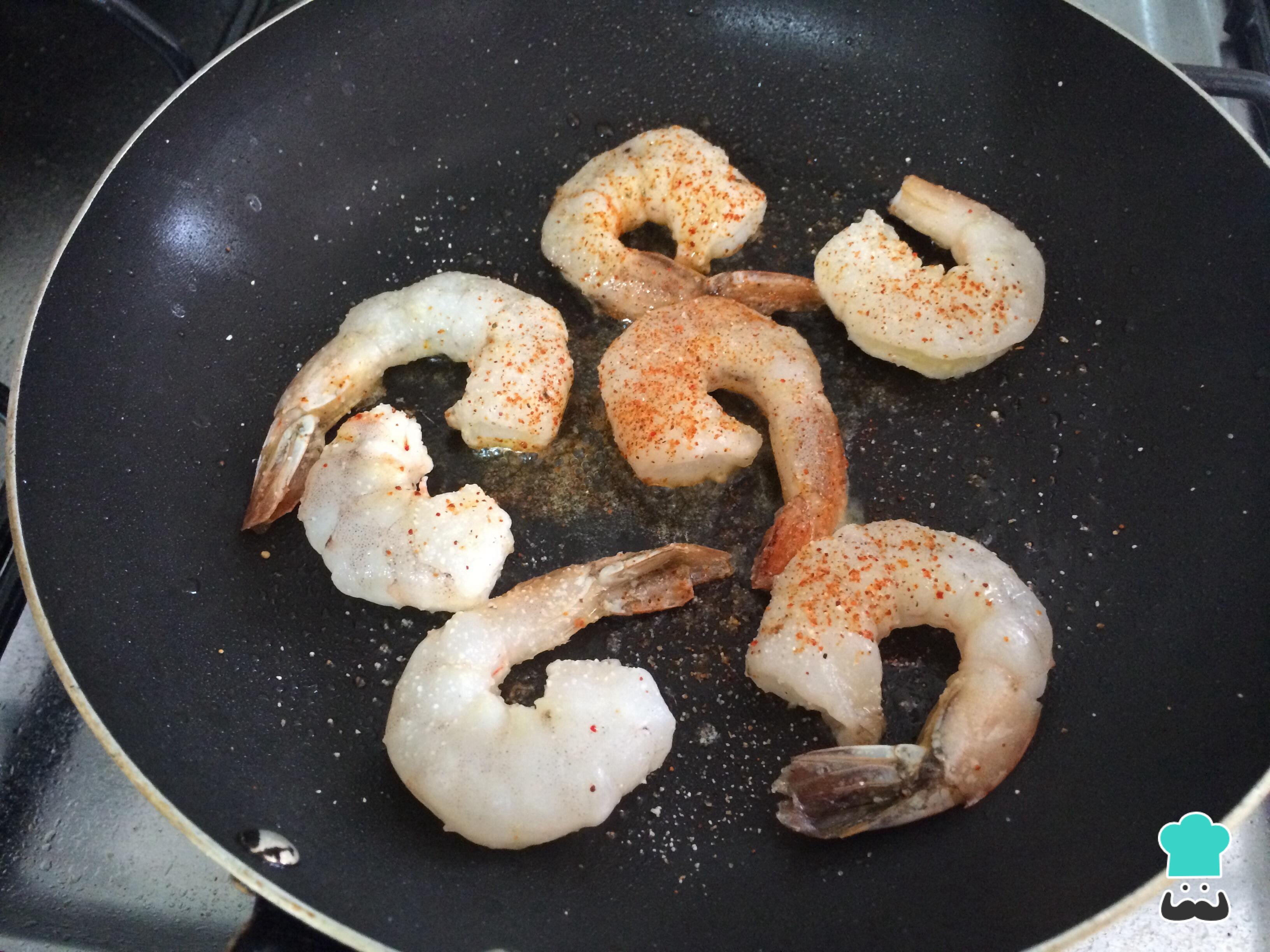 Saltear con aceite de oliva las gambas sazonadas con sal, pimienta, paprika y el ajo en polvo, cocinar durante 3 minutos hasta que estén doradas.