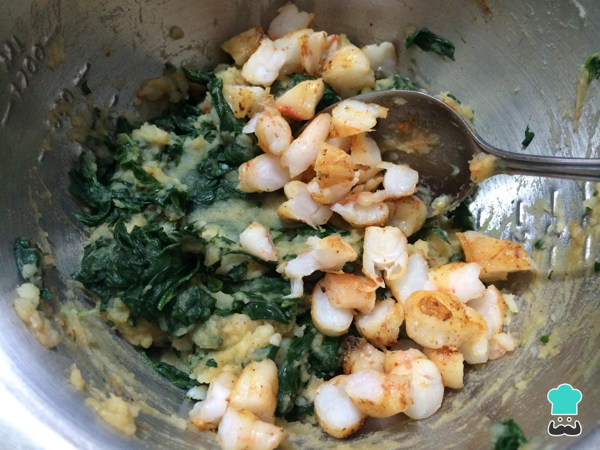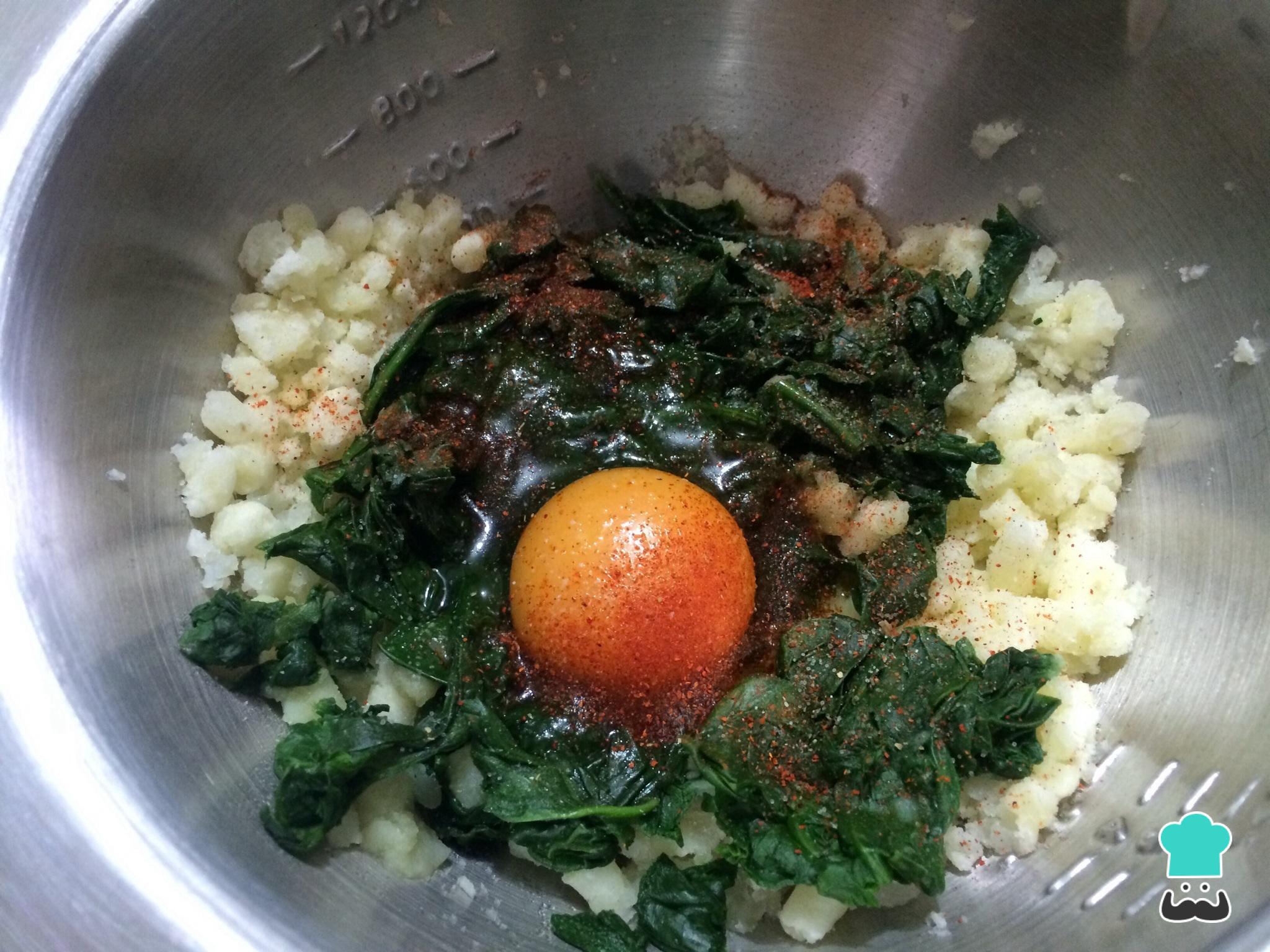 En un bowl mezclar el puré de patatas, el huevo, la espinaca, rectificar sabor con sal, pimienta y paprika.