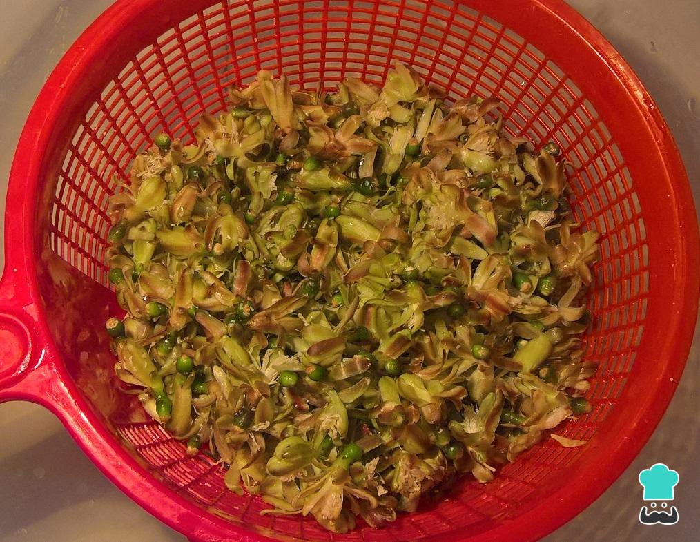Iniciamos la receta de tortitas mexicanas lavando perfectamente nuestras flores de garambullo. Una vez pasadas por el chorro de agua, las vamos a dejar un par de minutos desinfectándose en el agua limpia. Una vez pasado este tiempo escurrimos el agua y reservamos un momento.
