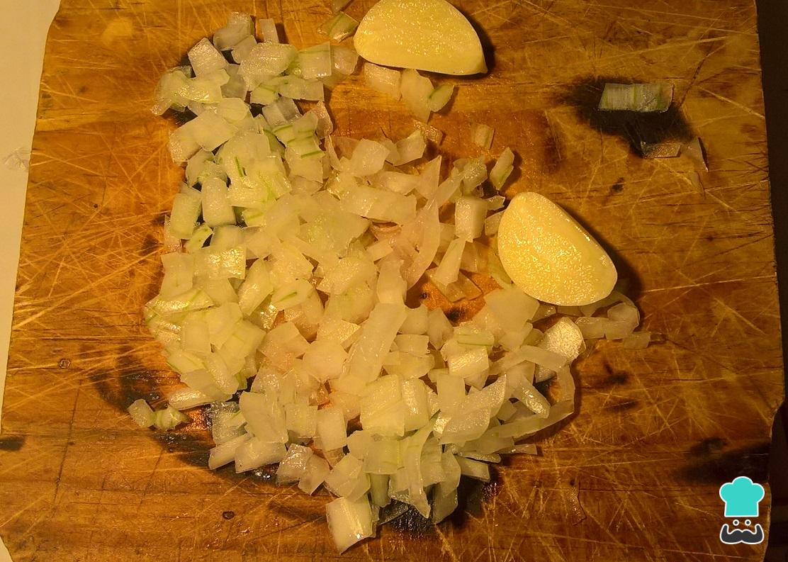 Mientras tanto tomamos la cebolla y la picamos finamente, así como podemos observar en la siguiente imagen, también tomamos el diente de ajo lo pelamos completamente y lo rebanamos a la mitad.