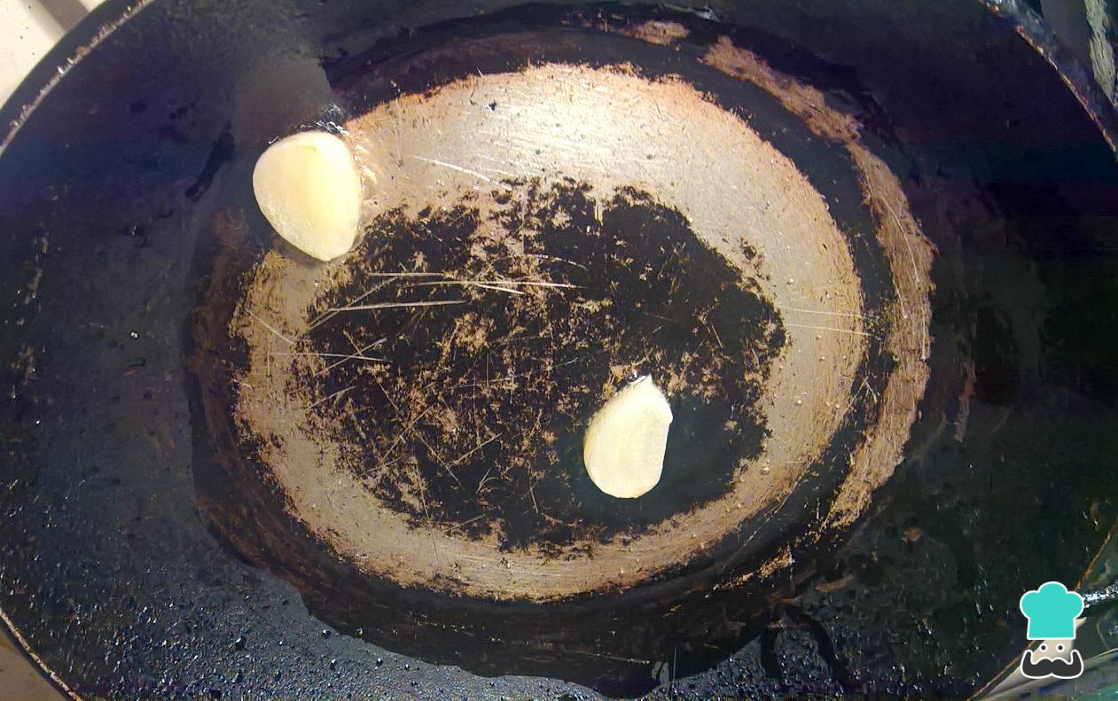 Ahora ponemos a calentar en un sartén el aceite y una vez este caliente añadimos las dos mitades de ajo y dejamos que se doren por 1 minuto. Esto hará que el aceite se aromatice con el ajo y nuestras tortitas de flor de garambullo tengan un mejor sabor.