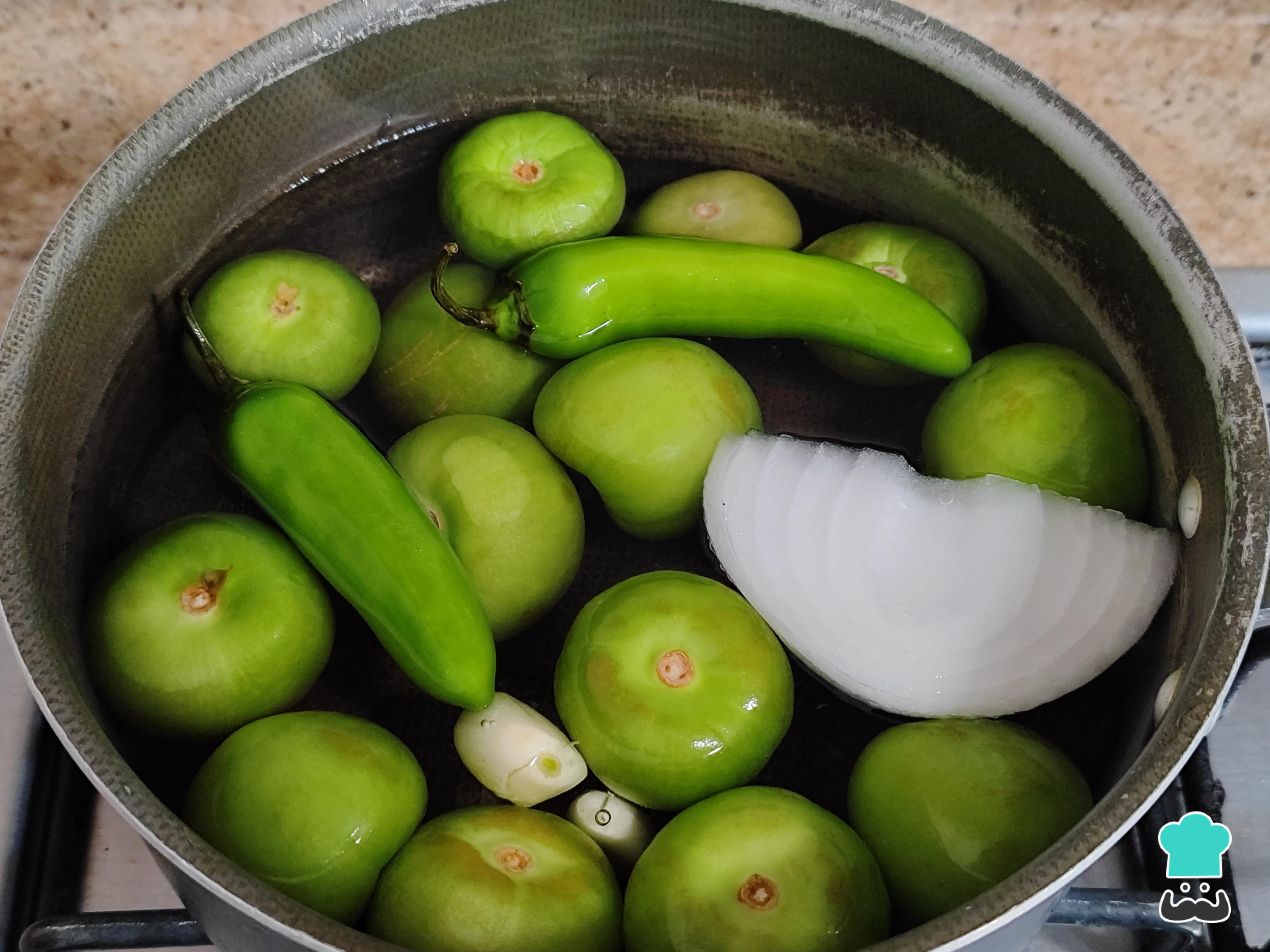 Hierve los tomates, el chile, la cebolla y el ajo durante 8 minutos. Licúa con un poco del agua de cocción, sal al gusto y cilantro fresco.