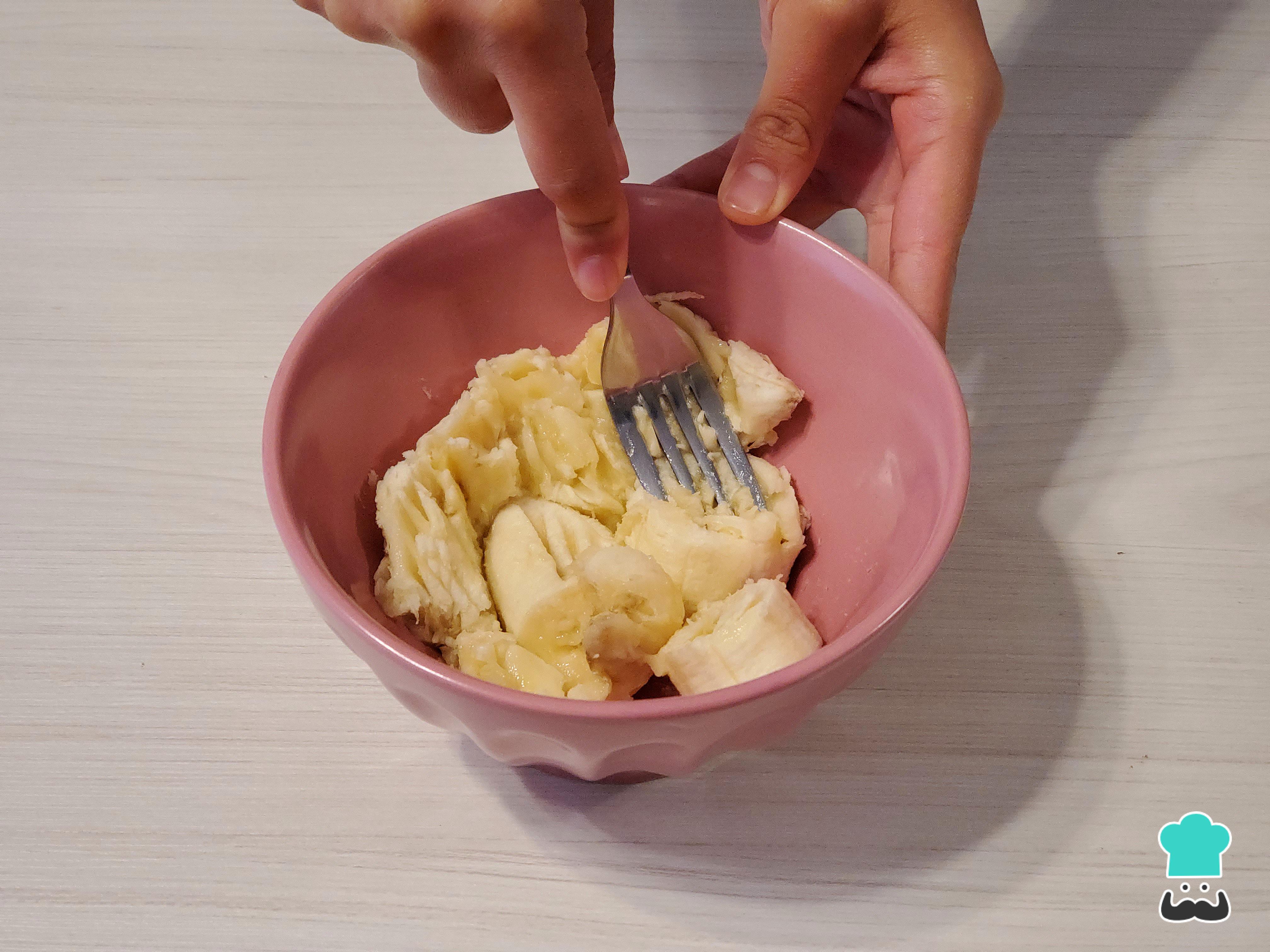 Empieza lavando y pelando los plátanos. Después, colócalos en un bowl mediano y con un tenedor aplástalos hasta que se forme una compota.
