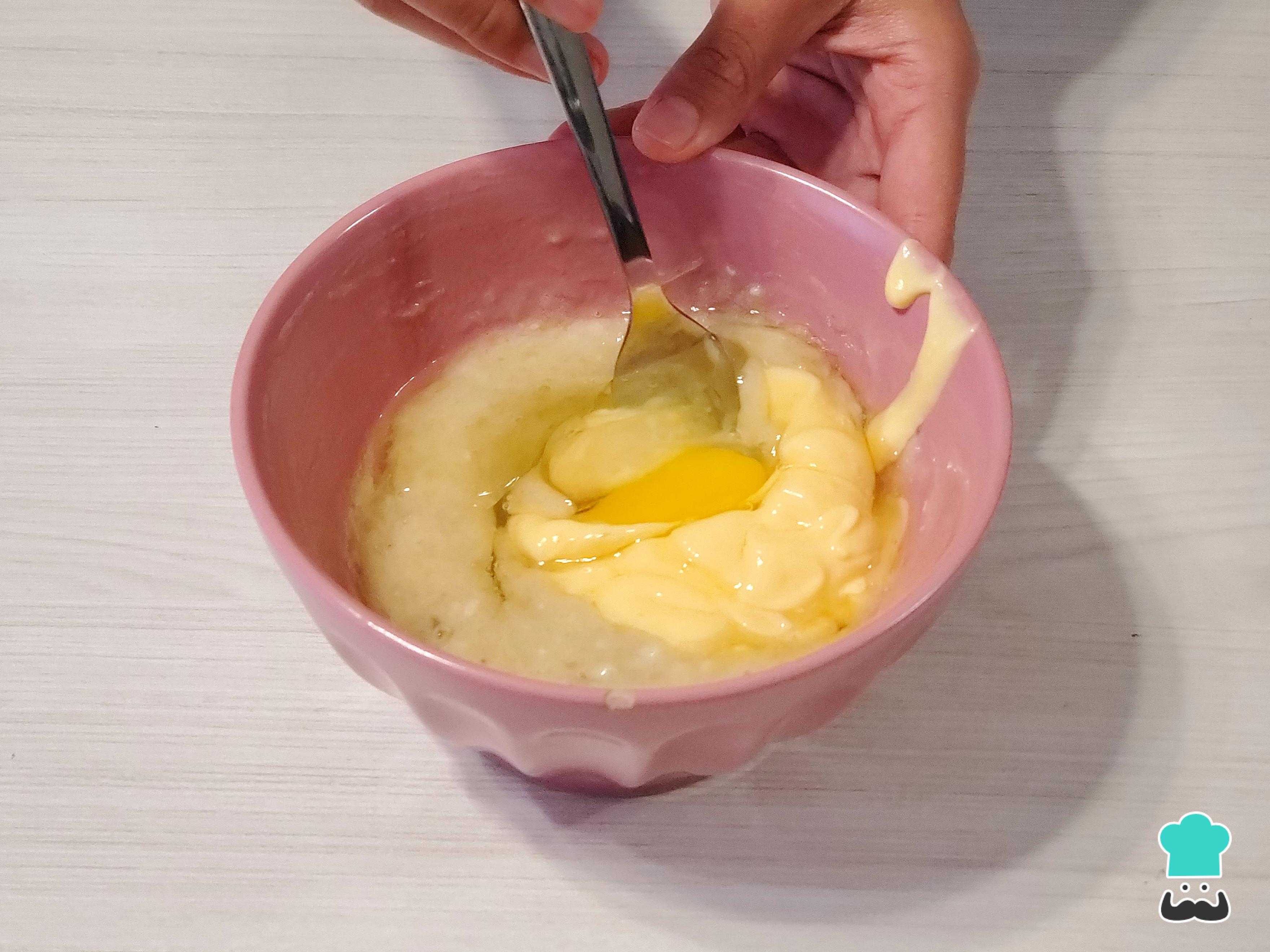 Encima vierte el yogur griego y los huevos. Mezcla bien con el tenedor para que todos los ingredientes se integren.