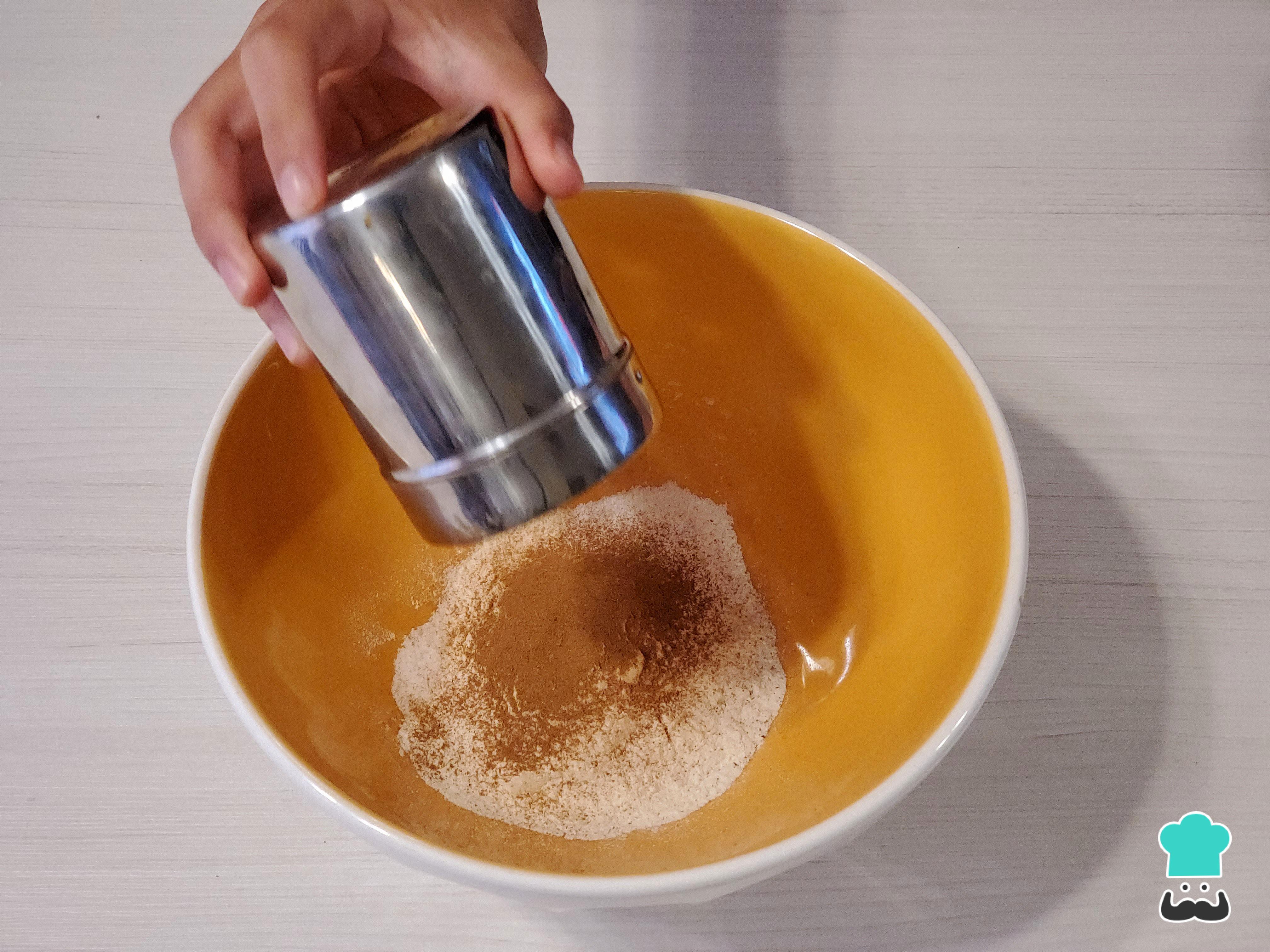 Aparte, en otro bowl grande, mezcla la harina, el polvo de hornear, una pizca de sal y especias como canela en polvo, nuez moscada, clavo de olor y/o cardamomo. Remueve bien, puedes continuar utilizando el tenedor. En el centro haz un agujero.