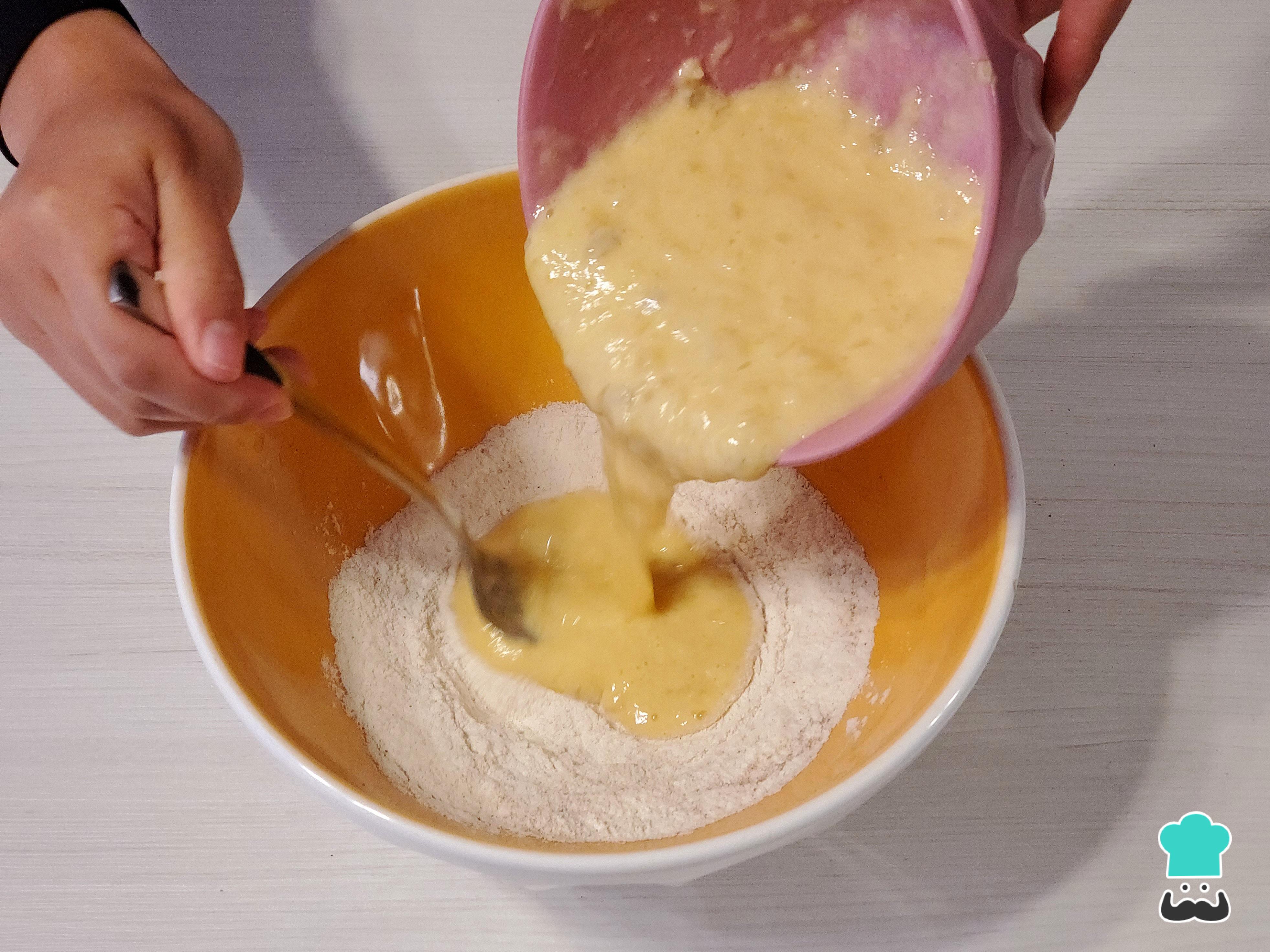 Cuando todos los insumos se hayan integrado, sigue mezclando para disolver todos los grumos de harina que se pueden confundir con trozos de plátano. Luego, cubre el bowl con papel film y refrigera la masa por lo menos 30 minutos.