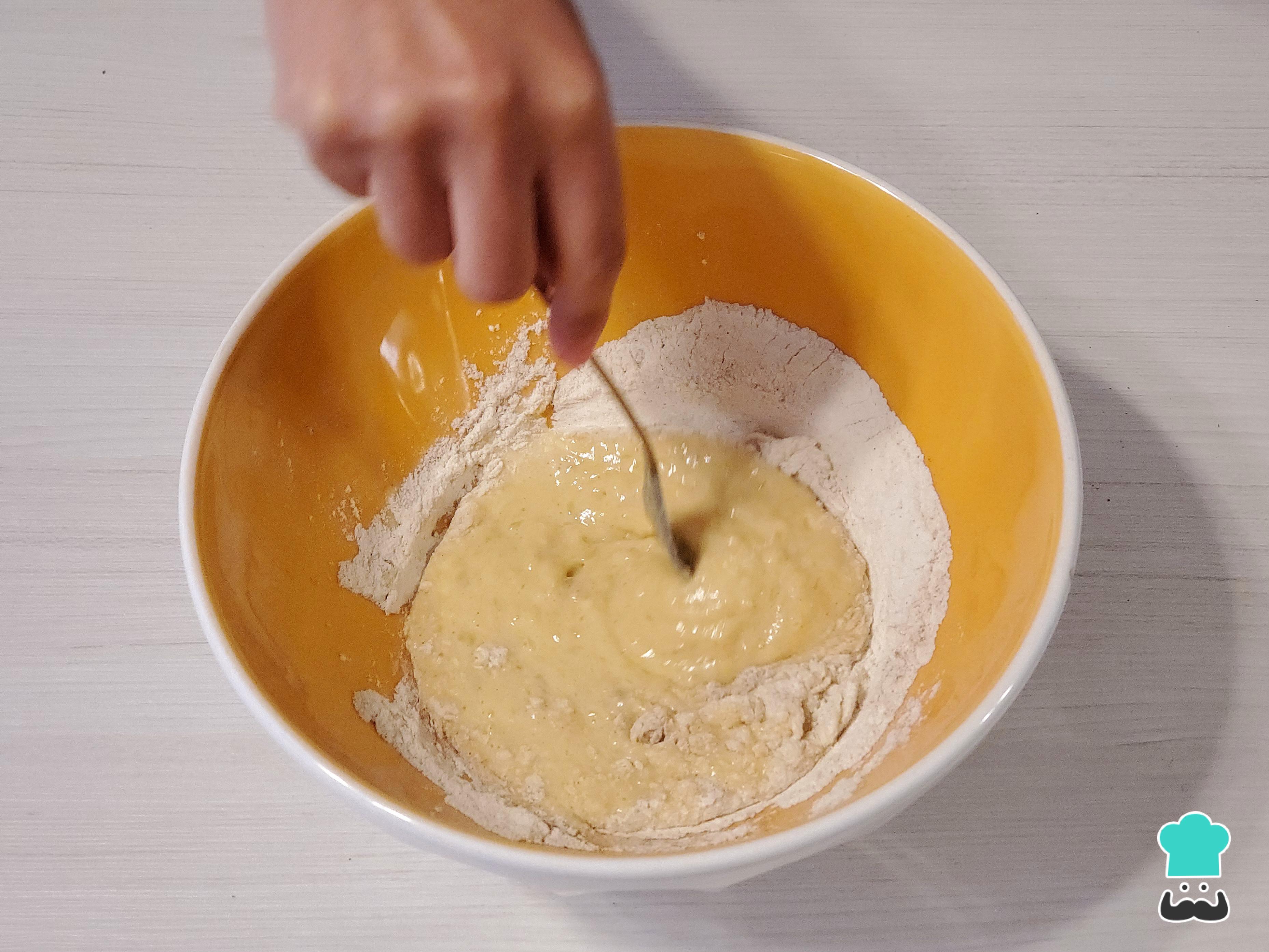 Vierte la mezcla de ingredientes líquidos dentro del hoyo de ingredientes secos y mezcla de adentro hacia afuera con la ayuda del tenedor.