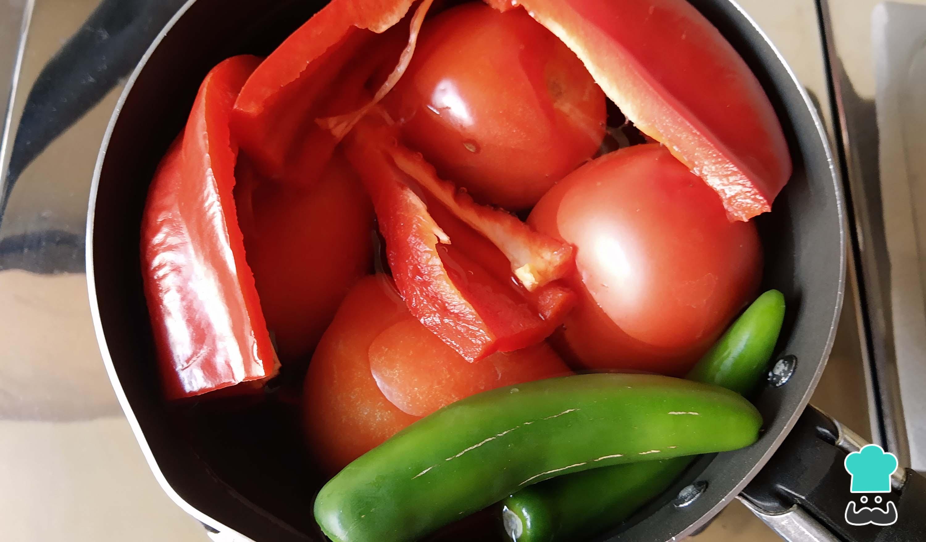 En una olla con suficiente agua, hierve por 8 minutos los jitomates, el pimiento rojo y los chiles.