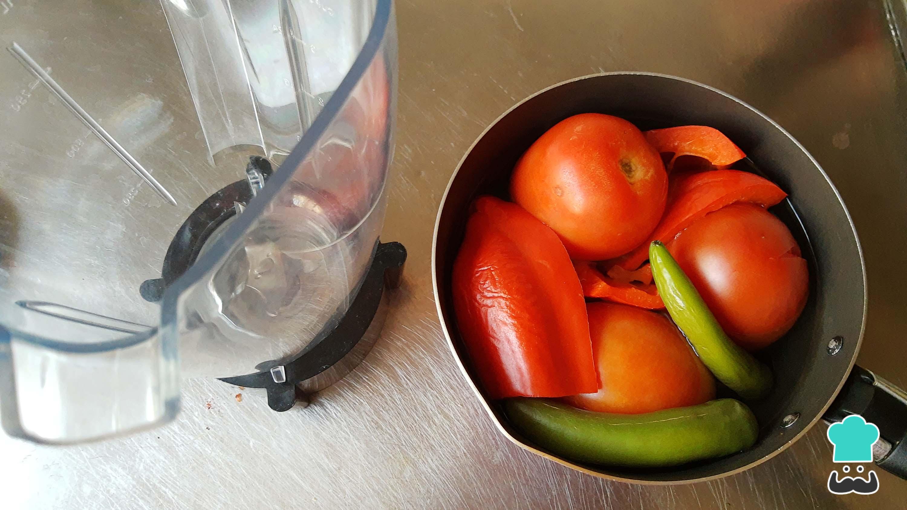 Luego licua los jitomates, el pimiento y los chiles con un trozo de cebolla, un diente de ajo y media taza de agua de la cocción de los jitomates. Deberás obtener una textura fina como puré.