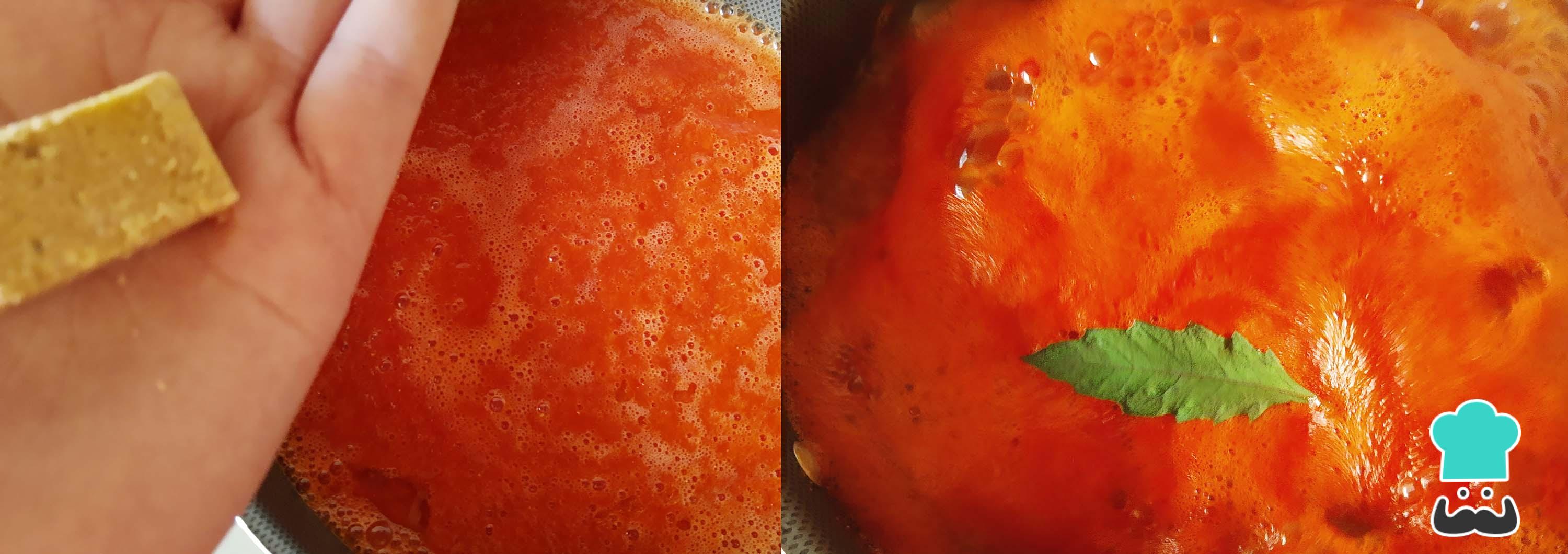Después, en una olla con una cucharada de aceite, sofríe la salsa roja que has preparado, agrega un cubito de caldo de pollo y 2 tazas de agua. Deja cocinar por 8 minutos, luego agrega las hojas de epazote y, si es necesario, sazona con un poco de sal al gusto. Deja cocinar toda la salsa por 5 minutos, luego retira del fuego y reserva.