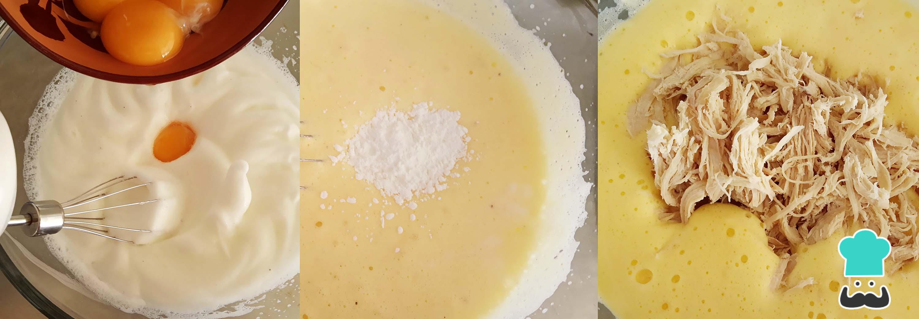 En un recipiente, monta las claras a punto de nieve con un poco de sal y pimienta al gusto. Luego, agrega una a una las yemas de huevo y bate por unos segundos. Enseguida, añade una cucharada de fécula de maíz y mezcla para integrar todo. Vacía el pollo desmenuzado a la mezcla de huevo y mezcla de forma suave.