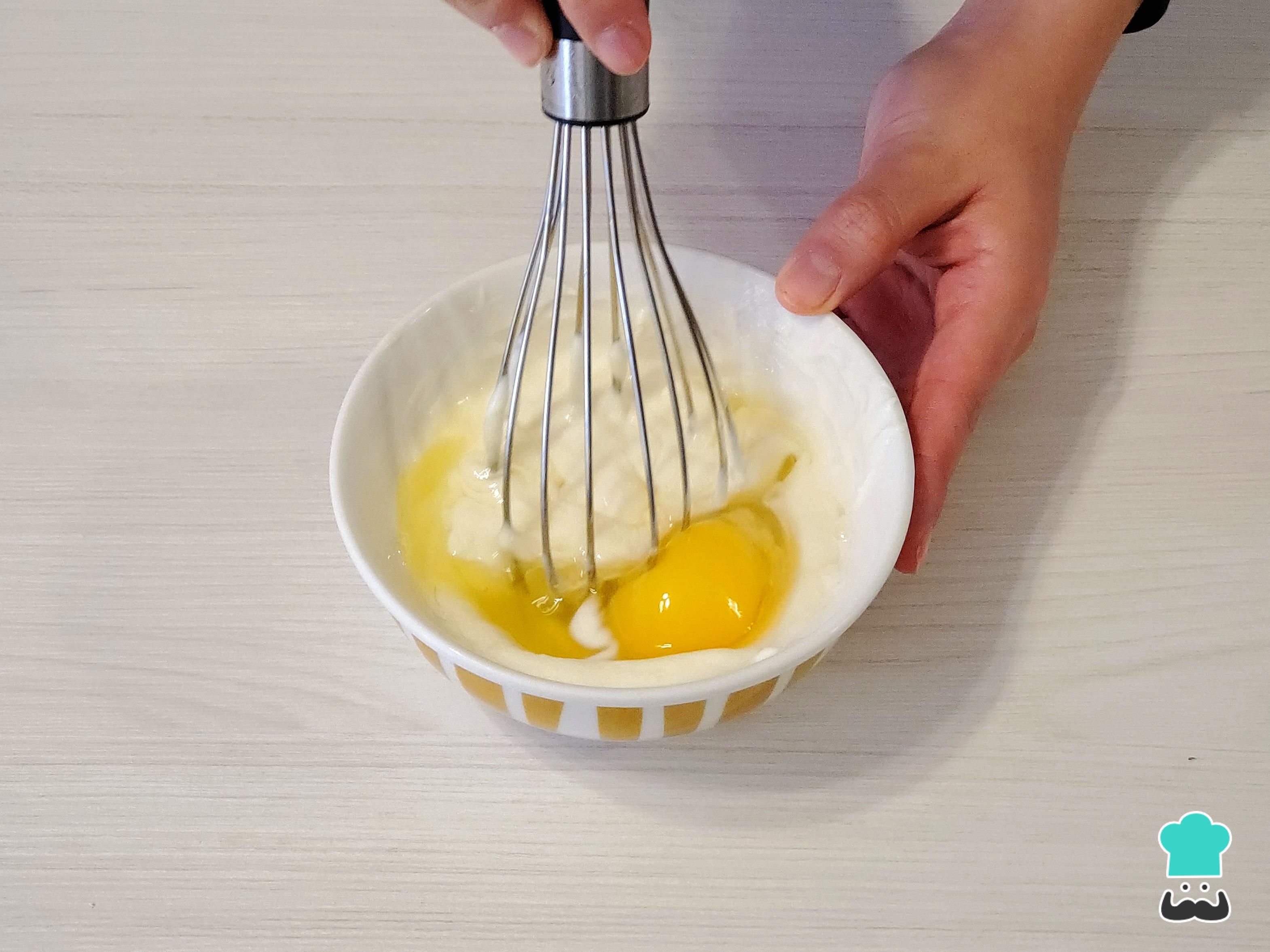 Comienza mezclando los huevos con el yogur griego y la leche, utiliza un batidor de globo para obtener una mezcla homogénea. Reserva.