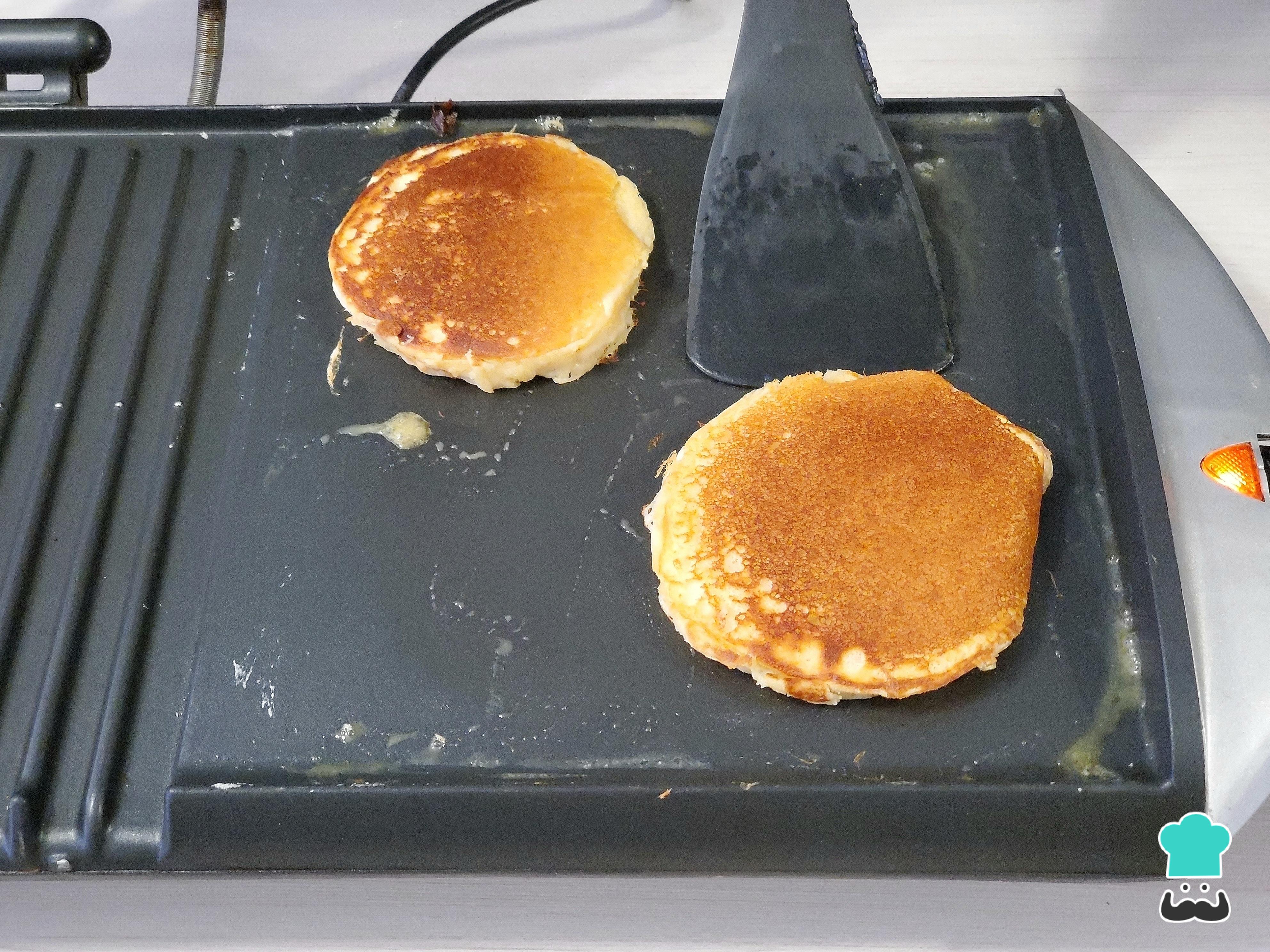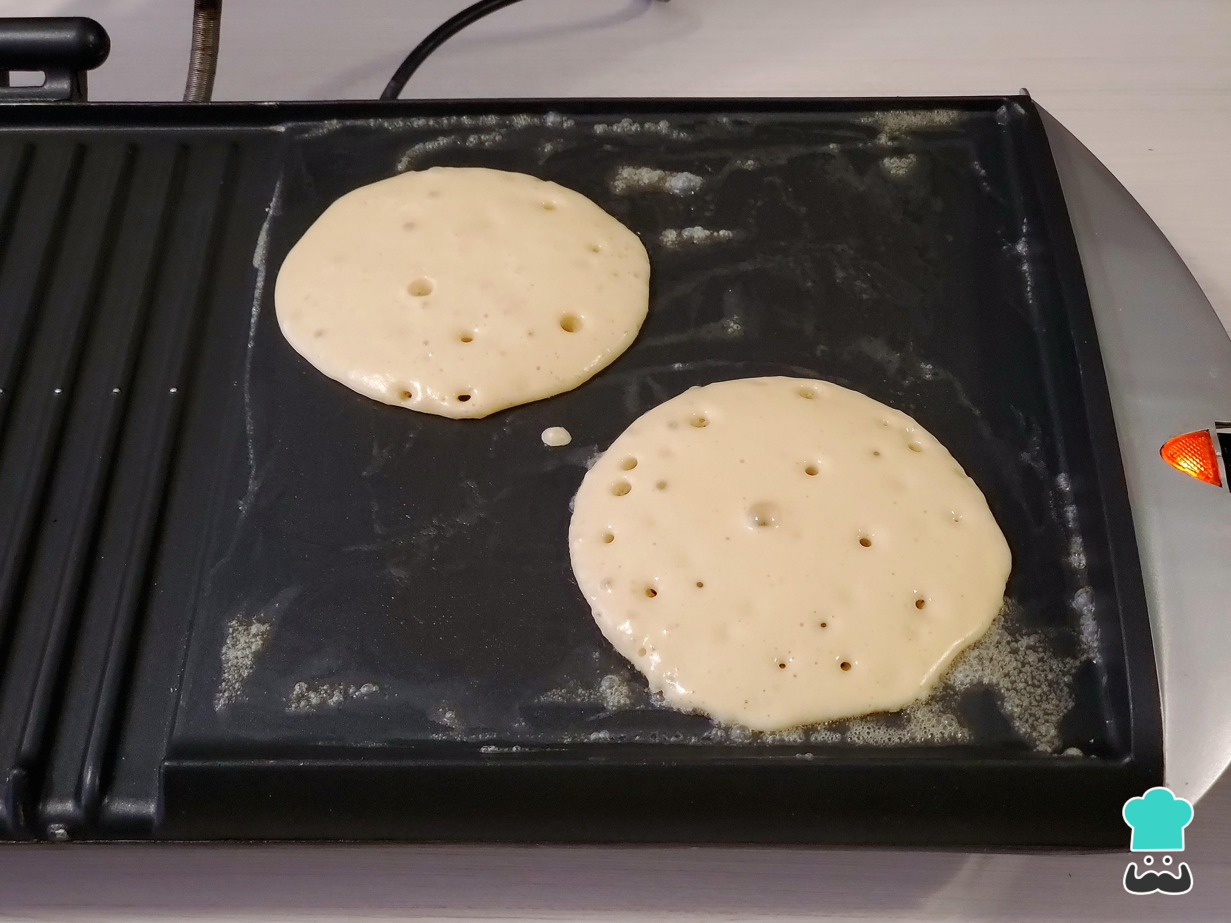 Deja que se cocinen a fuego medio-bajo hasta que empiecen a burbujear. Luego, introduce rápidamente una espátula por debajo del pancake y proporciona la vuelta.
