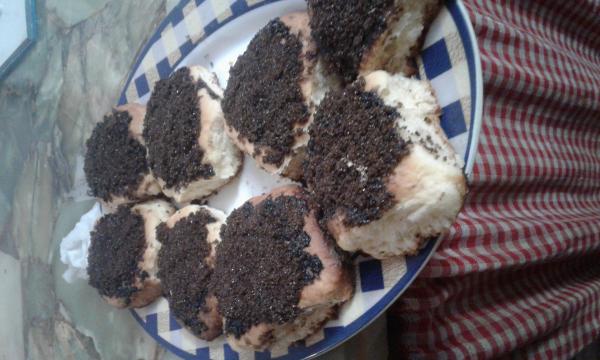 Pincela con un poco de agua las tortitas para que el azúcar moreno pueda adherirse bien. Luego, espolvorea el azúcar negra sobre cada tortita. Déjalas levar por media hora más.