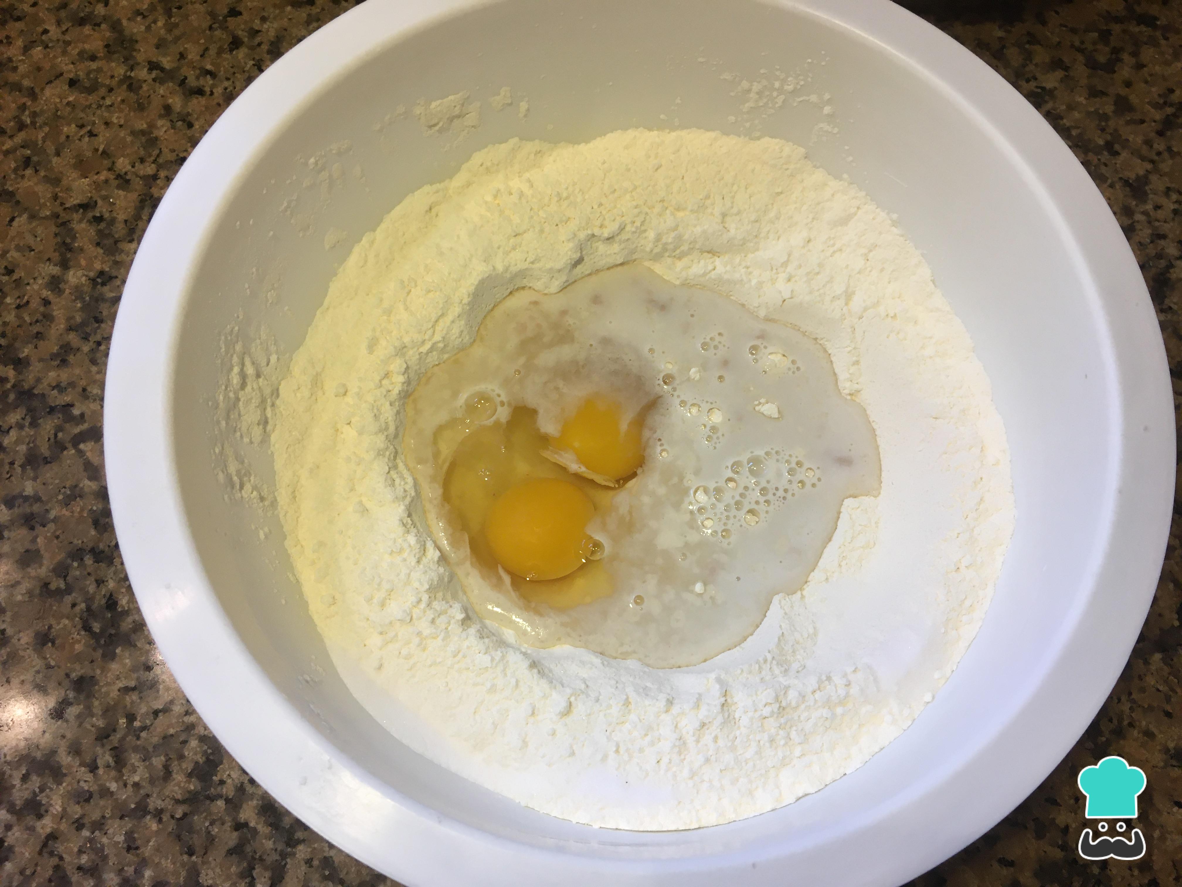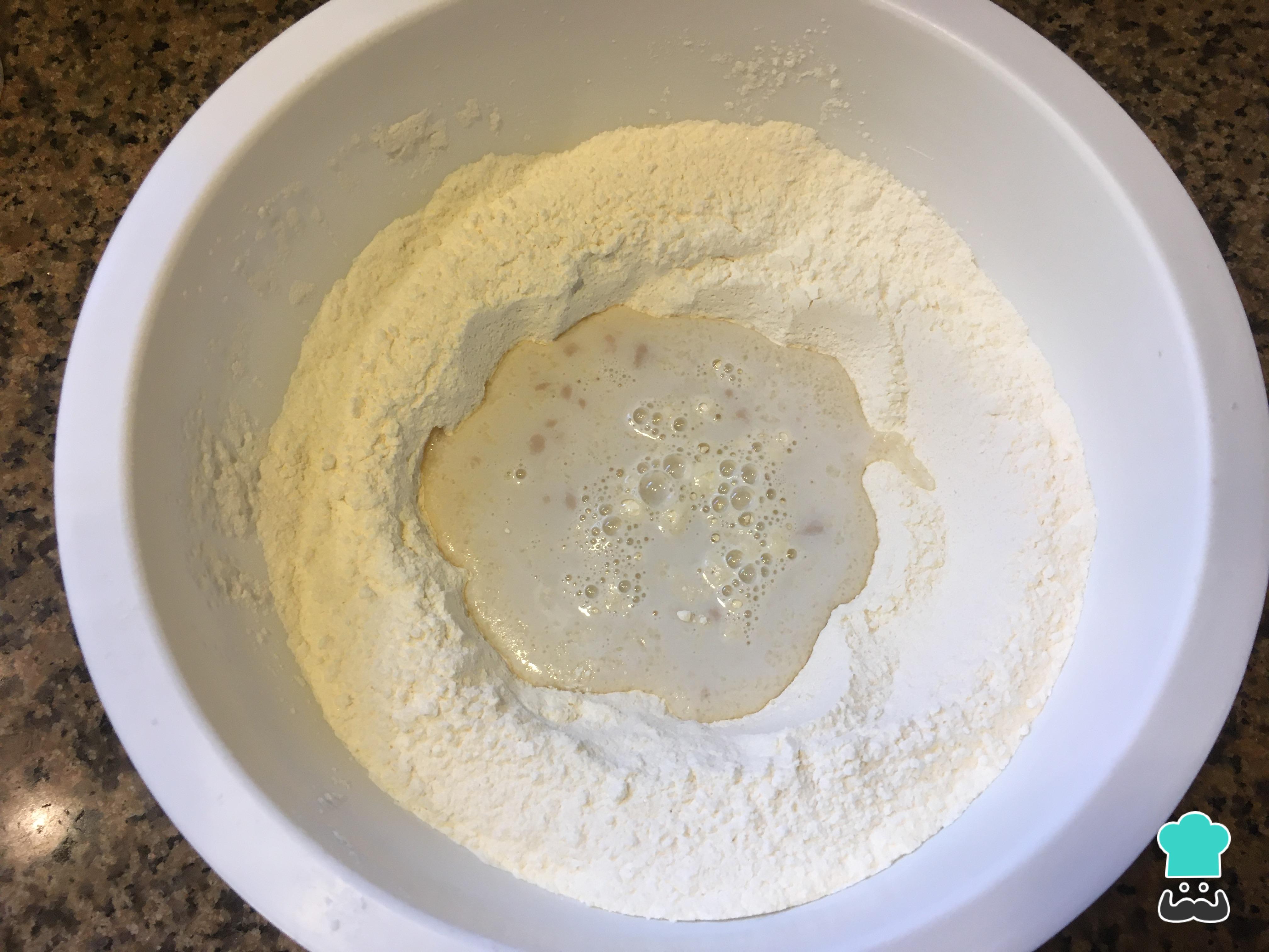En otro recipiente, mezcla la harina y el azúcar dejando un hueco en el medio. Vierte allí la mezcla de leche y levadura.