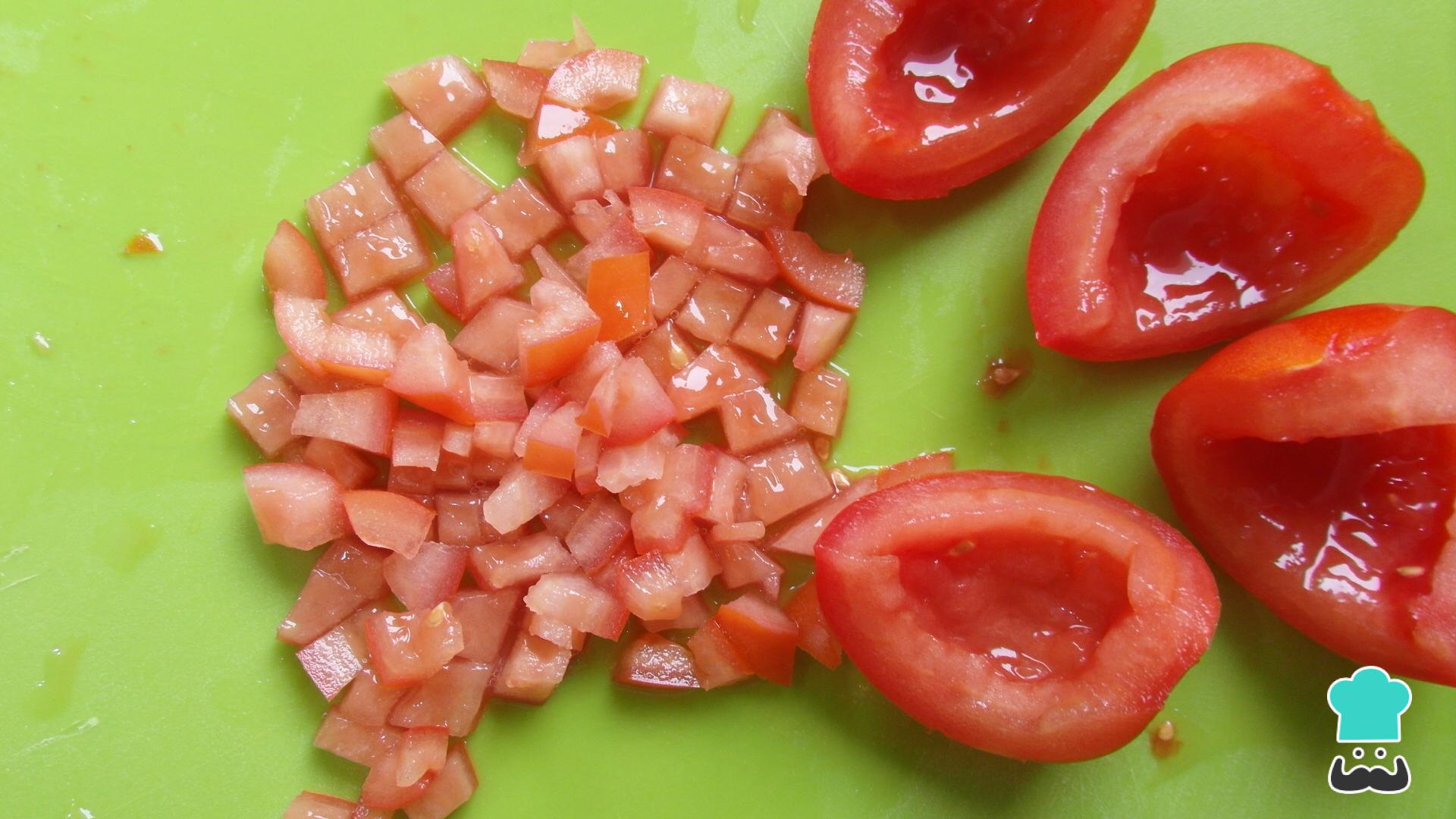 Luego, lava los tomates, córtalos en cuartos y retira las semillas. Después, pica finamente cada cuarto de tomate, tal y como se muestra en la fotografía.