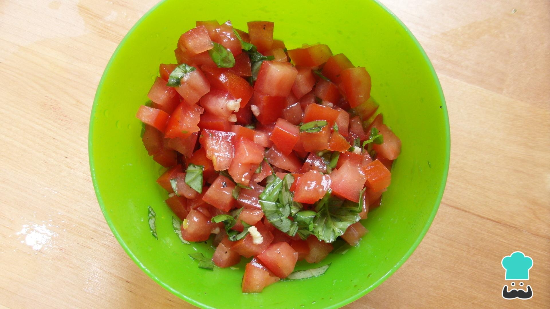 Coge un bol, introduce los tomates picados en él, añade las hojas de albahaca cortadas en tiras, el vinagre balsámico, aceite de oliva, la mitad de los ajos pelados y machacados, sal y pimienta al gusto. Mezcla y deja macerar en el frigorífico durante una hora, revolviendo de vez en cuando.