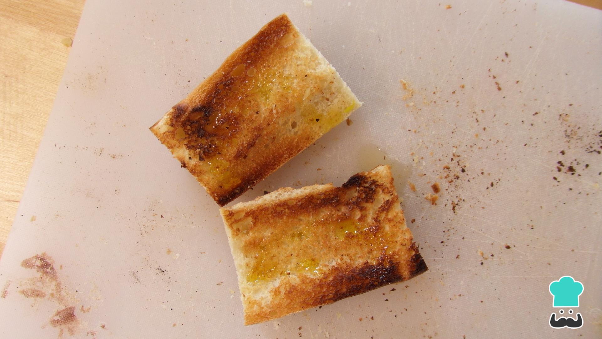 Pasado el tiempo de reposo, y para seguir con la preparación de las tostas con tomate y albahaca, corta el pan en rebanadas del tamaño que quieras y tórralas en una tostadora o sartén. Luego, frota cada tostada de pan con los ajos restantes y rocía con un poco de aceite de oliva.