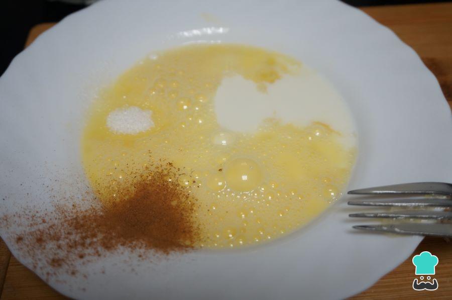 Para preparar las tostadas francesas o french toast, primero debes preparar todos los ingredientes. Para ello, en un bol o en un plato añade los huevos, la leche, el azúcar y la canela. Bate bien la mezcla para que todos los ingredientes se hayan integrado.