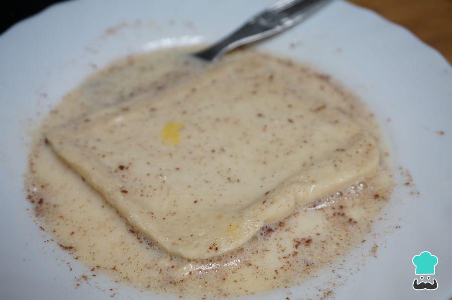 Añade las rebanadas de pan en la mezcla anterior y deja unos segundos para que se empape bien por los dos lados. Ten cuidado que no se rompan al cogerlas.