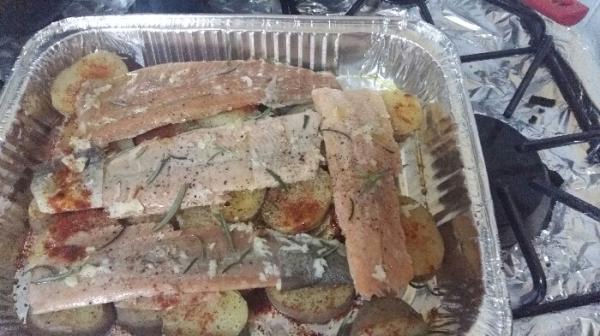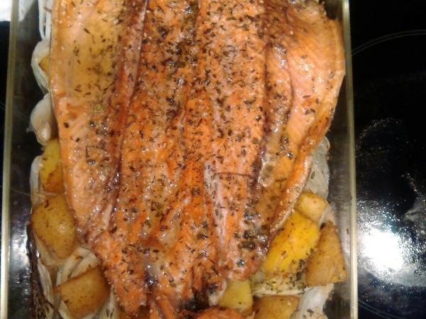 Retirar la cabeza y las espinas de la trucha, disponer los filetes sobre las patatas, aderezar con ajo macerado, una gotas de limón, sal, pimienta, una pizca de finas hierbas y un poco de aceite. Llevar al horno a 200ºC durante 10 minutos.