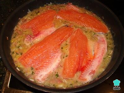 Precalentar el horno a 200 °C y asar las truchas cinco minutos, hasta que se empiecen a dorar; mientras tanto, añadir la sidra al conjunto de puerro y remover, hasta que comience a hervir.