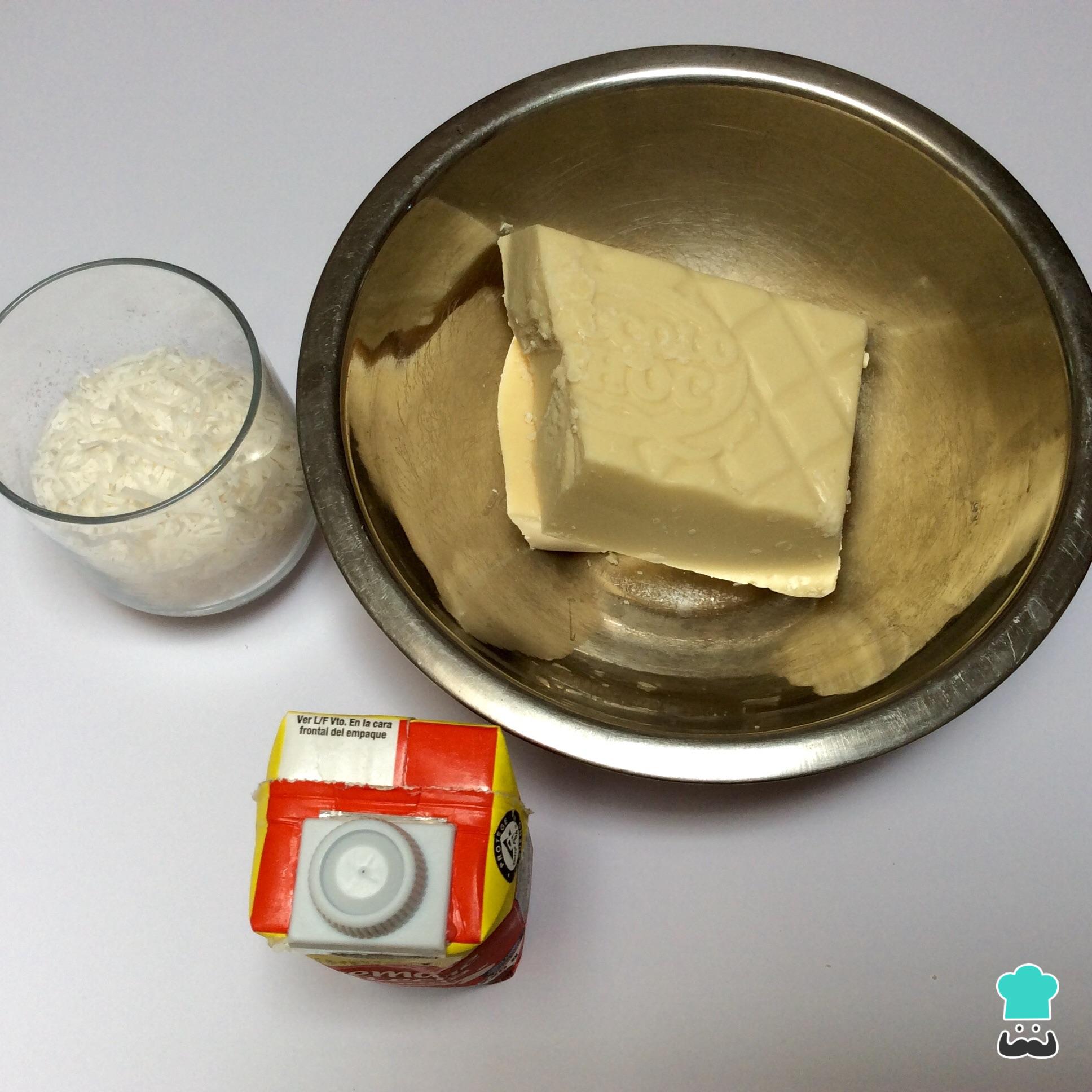 Para estas trufas de chocolate blanco y coco lo primero que debes hacer es alistar todos los ingredientes. Recuerda que estos dan para 20 bombones de chocolate blanco y coco medianos.