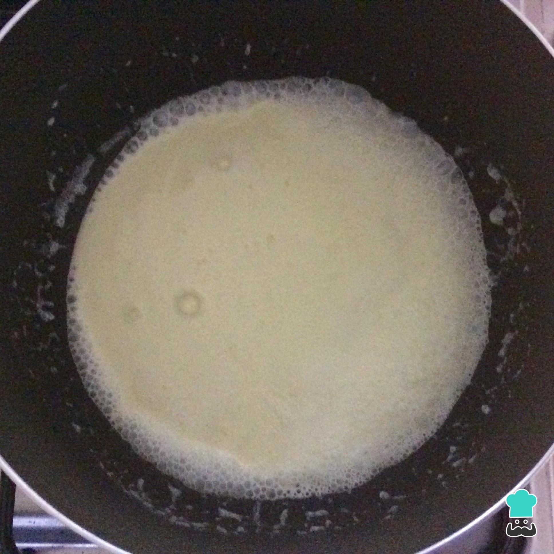 Para empezar a preparar las trufas de coco y chocolate blanco debes calentar la crema de leche a fuego alto hasta que esté hirviendo.