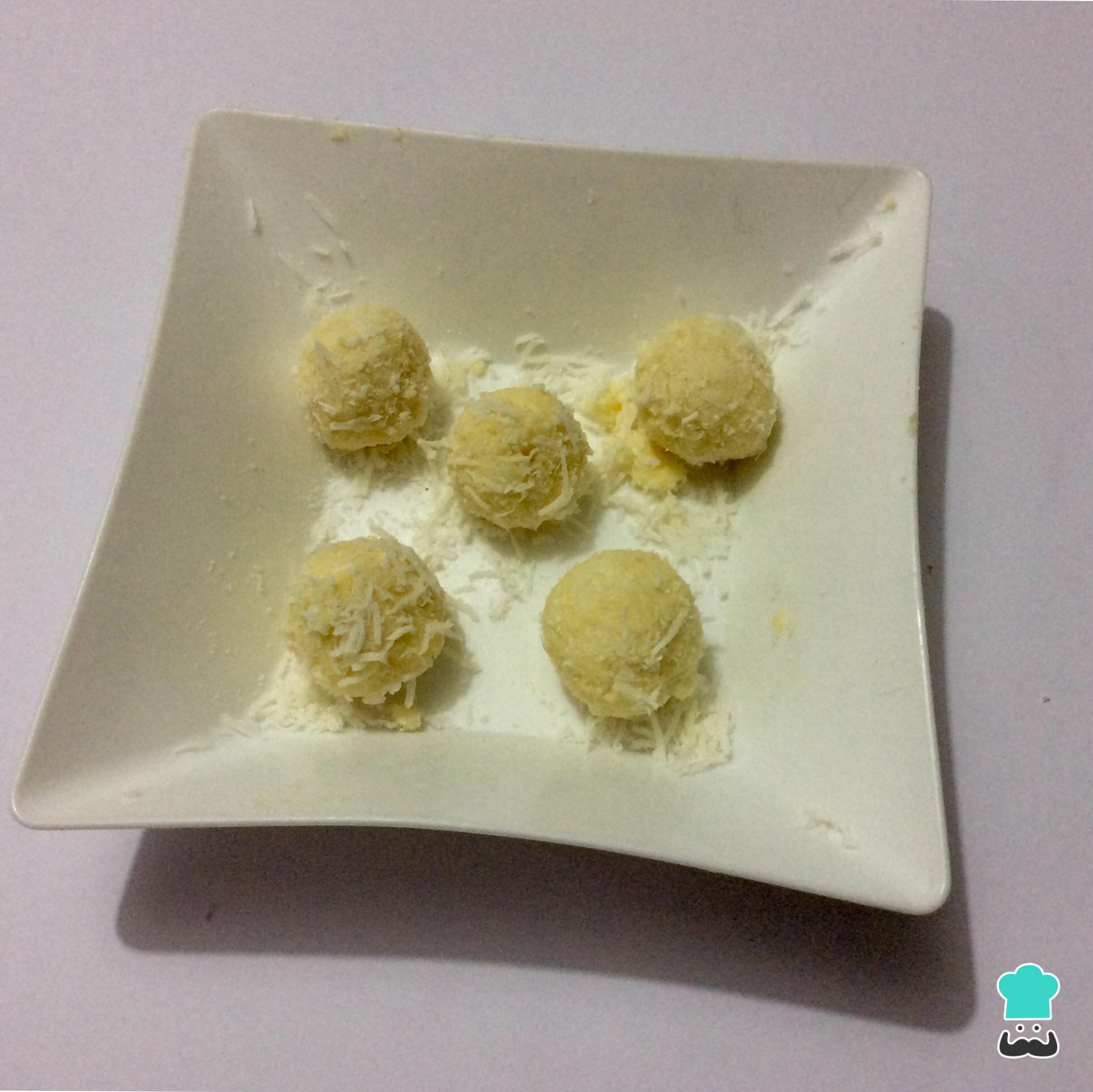Cuando la mezcla de las trufas esté casi dura, forma bolitas del tamaño que desees. Esto lo haces tomando una pequeña porción y formándolas en tus manos. Luego, pásalas por coco rallado.
