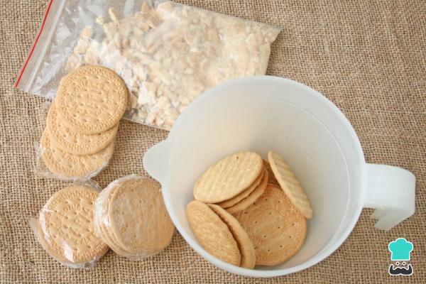 Empieza por hacer polvo las galletas. Para ello, puedes machacarlas dentro de una bolsa plástica o ponerlas en un picador de comida, como una batidora o una licuadora.