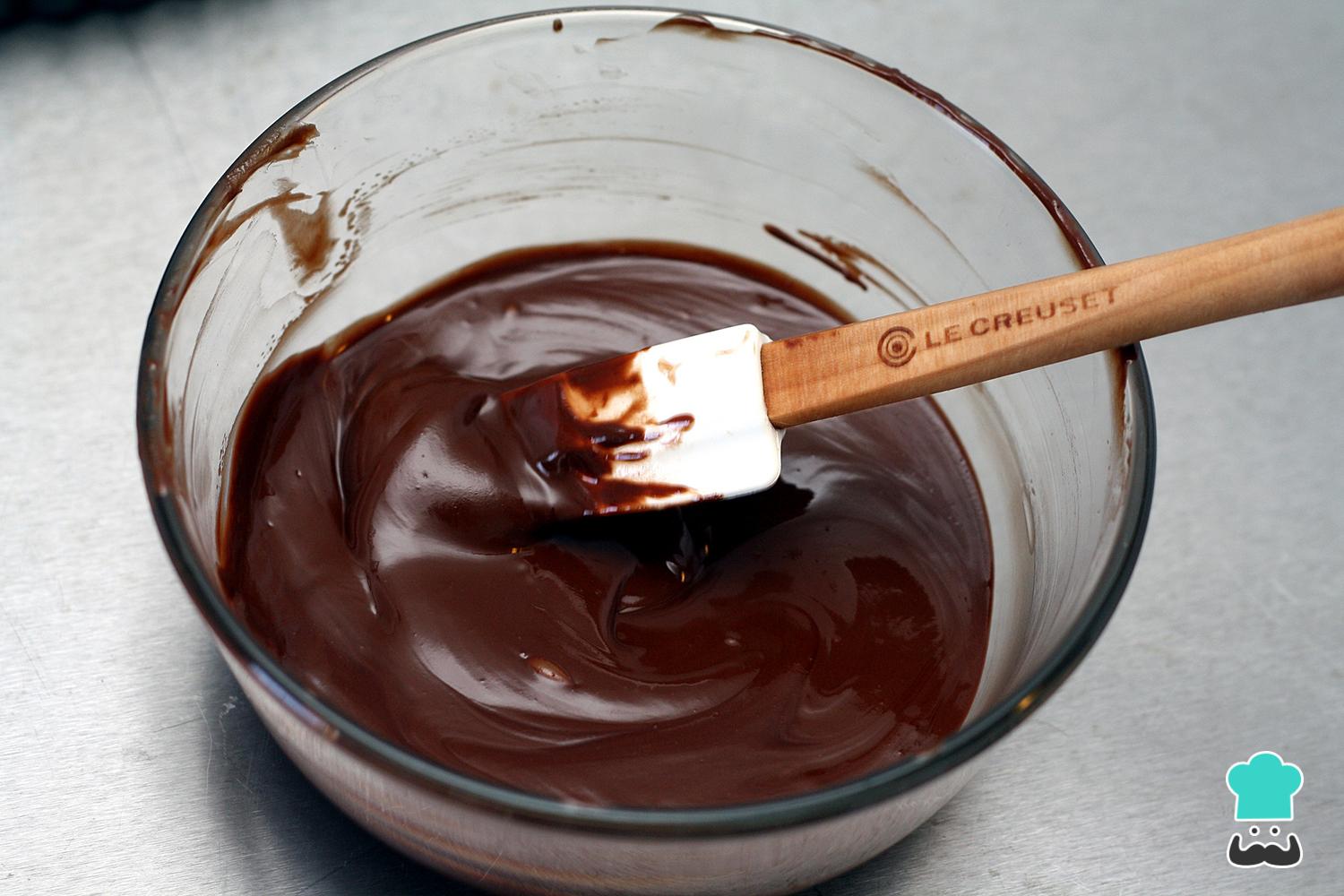 Aparte, derrite la tableta de chocolate a baño María hasta que quede disuelto. También puedes derretirlo usando el microondas, pero en este caso deberás trocearlo y calentarlo a máxima potencia por intervalos de 30 segundos para evitar que se queme.
